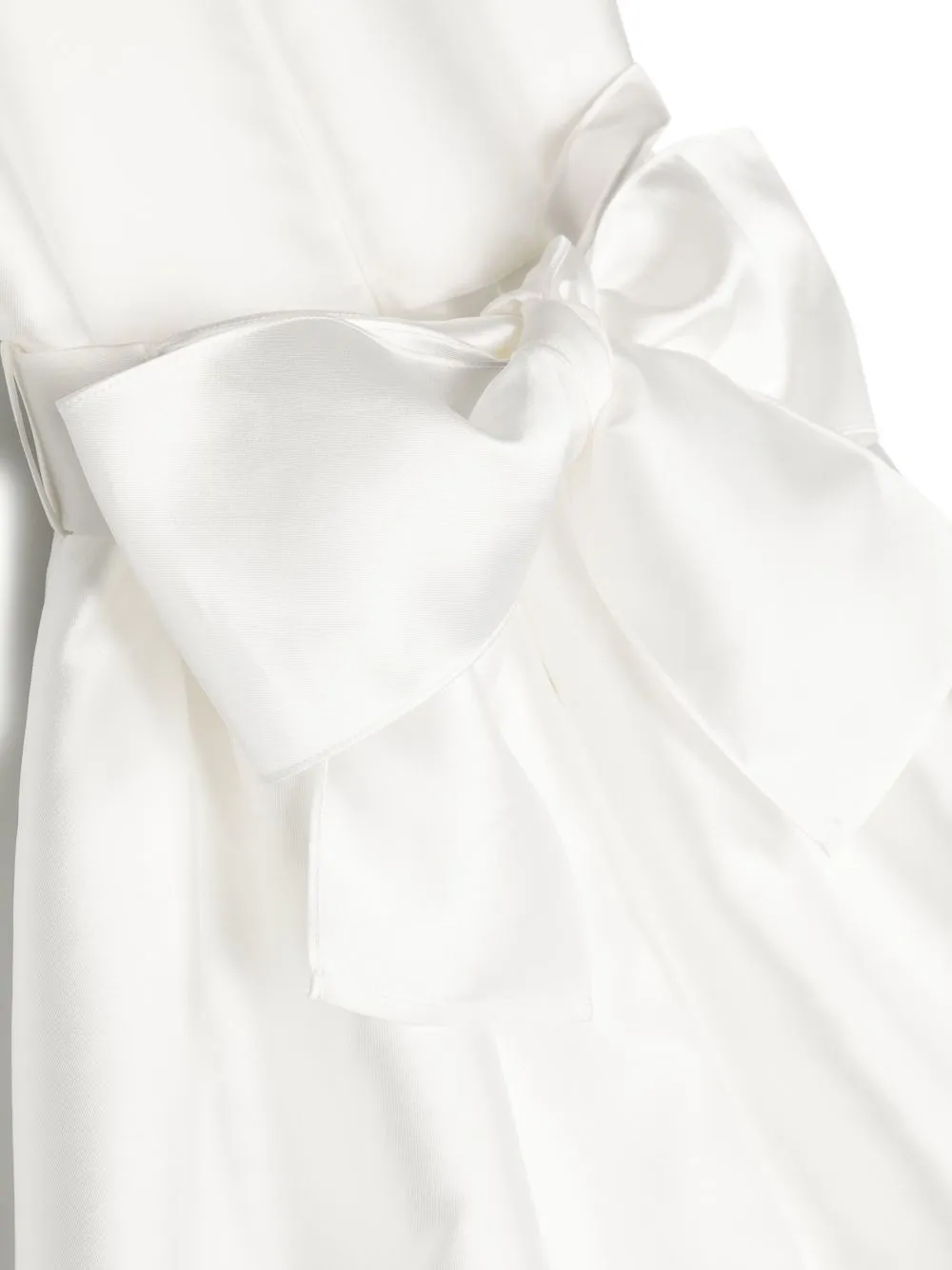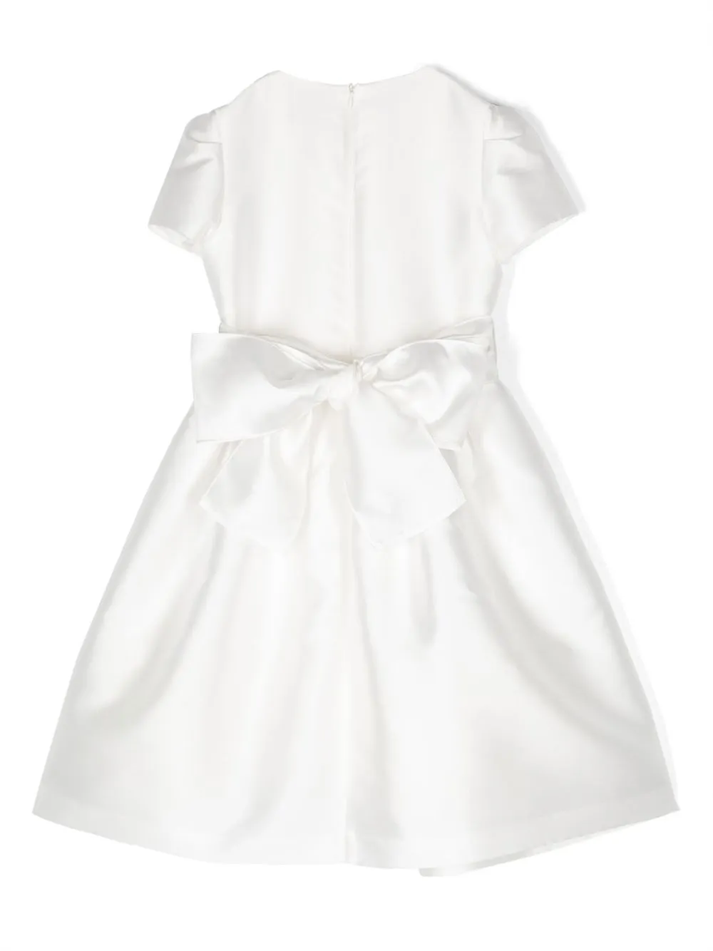 Белый, бант, круглый вырез, застежка на молнии сзади, короткие рукава и прямой подол.