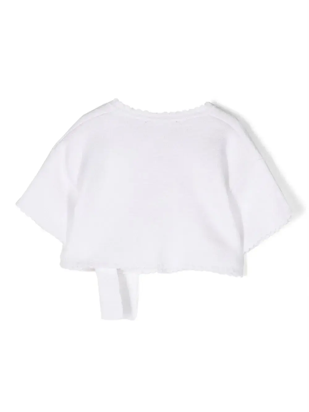 Белый, хлопок, трикотажный материал, тонкая вязка, V-образный вырез, модель на запах, завязки по бокам, короткие рукава и укороченная длина.