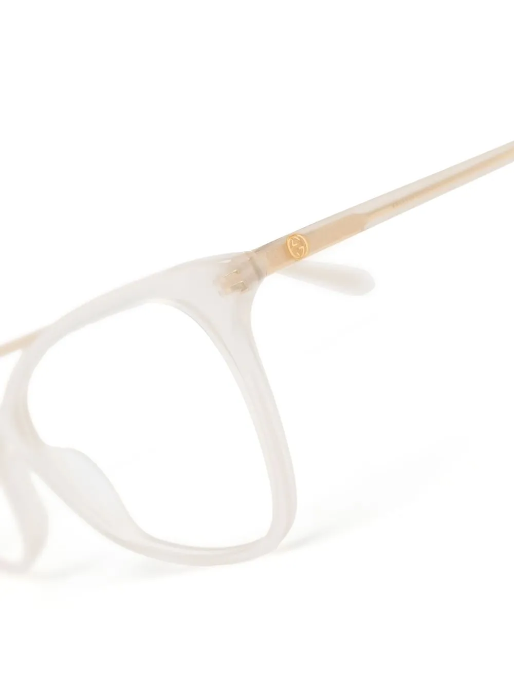Белый, золотистый, ацетат, прозрачный материал, логотип Interlocking G, гравированный логотип на дужках, оправа «кошачий глаз», прозрачные линзы, дужки с закругленными концами и прямые дужки. В комплект входит защитный чехол для очков. Обратите внимание, что на FARFETCH продаются оправы с линзами без диоптрий.