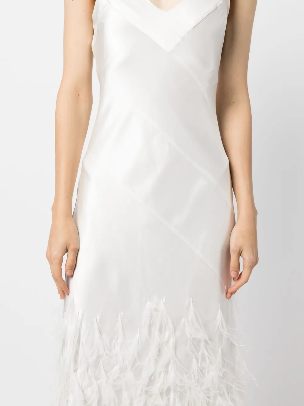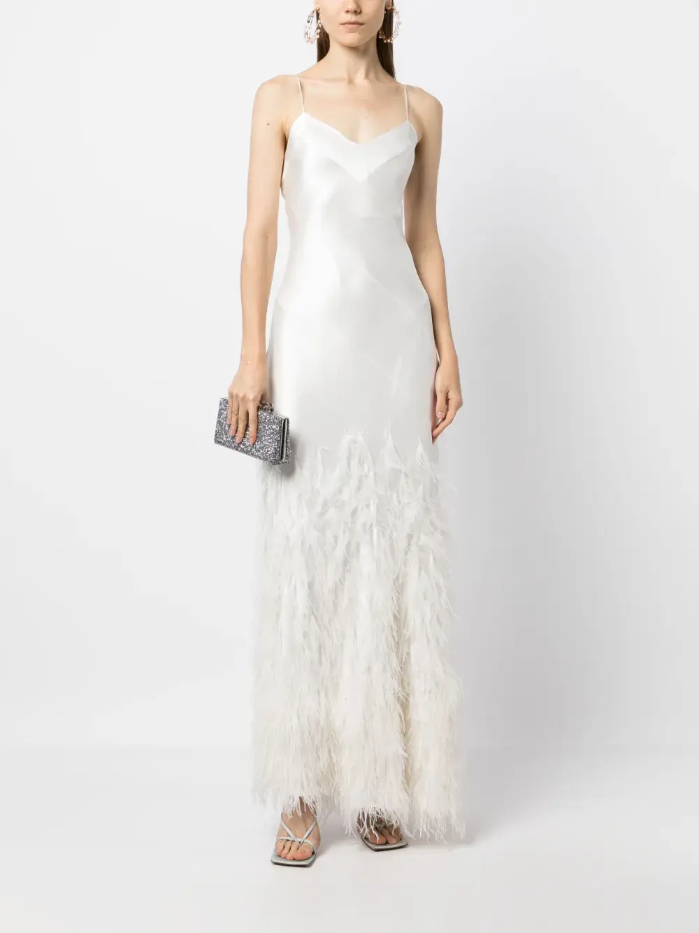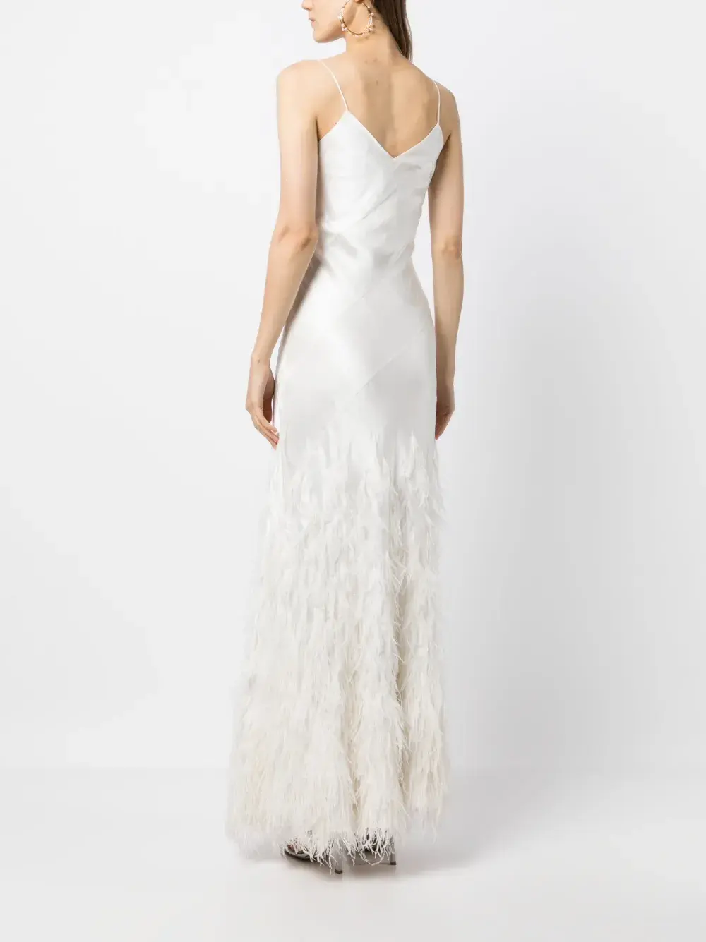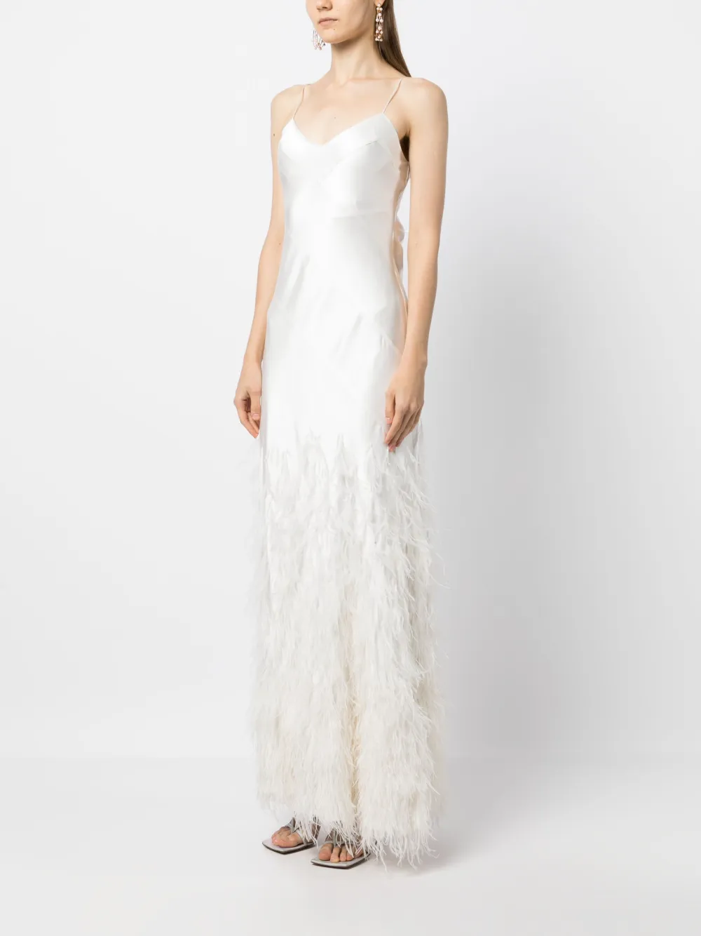 Кремовый, шелк, страусиные перья, сатиновый финиш, перья, V-образный вырез, тонкие бретели и длинная модель.