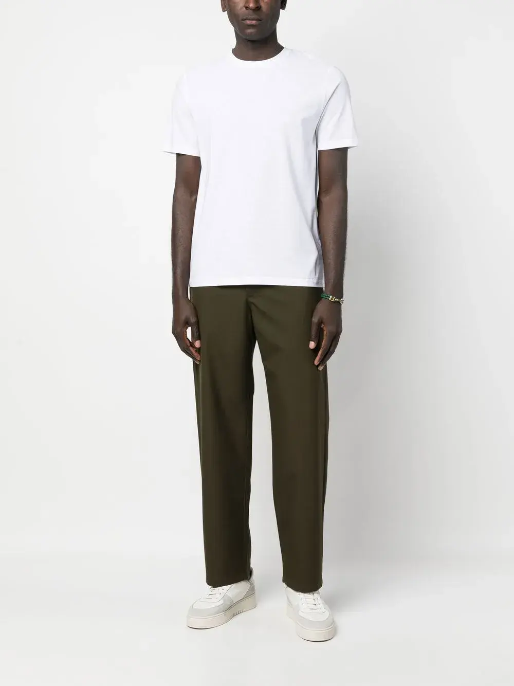 Молочно-белый, хлопок, металлический логотип, круглый вырез, короткие рукава и прямой подол.