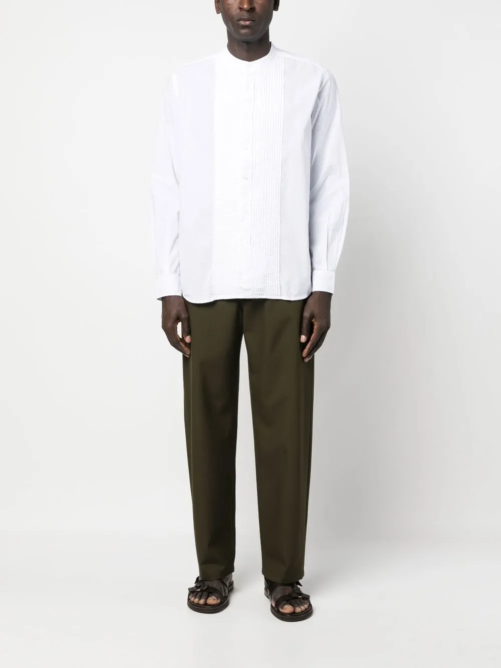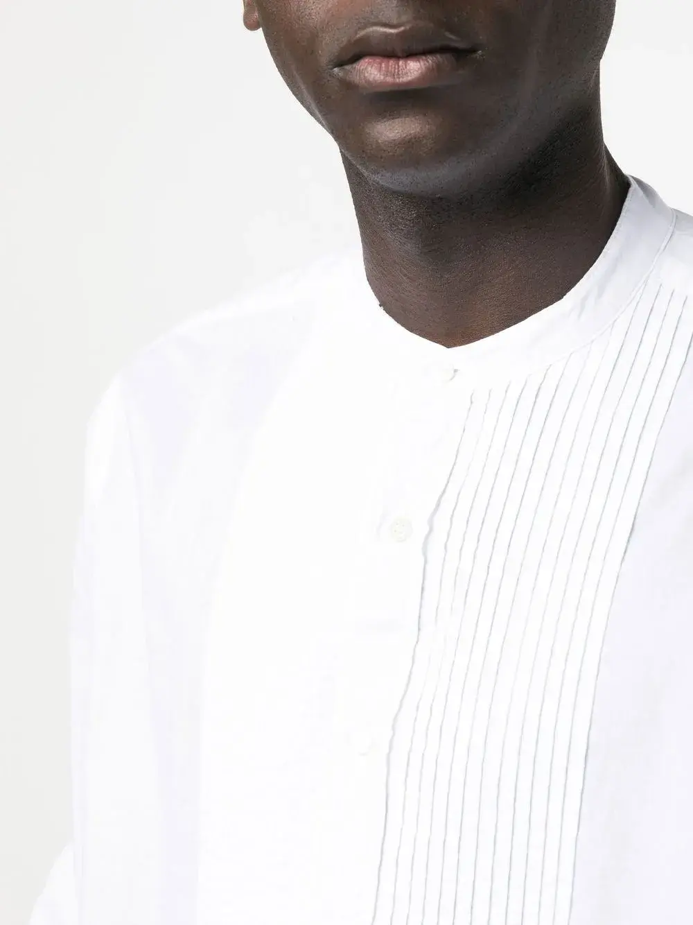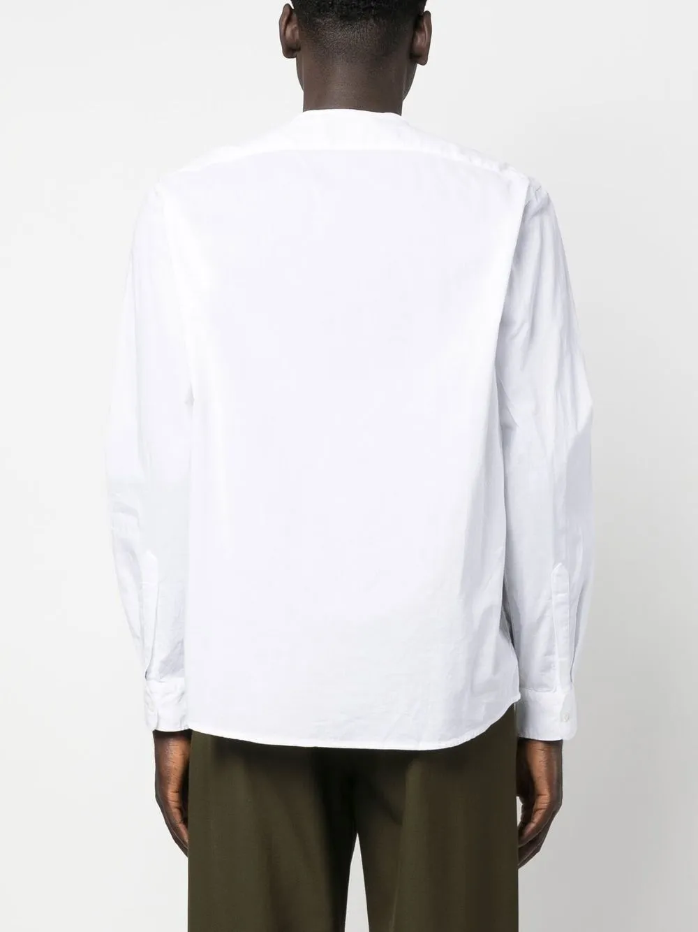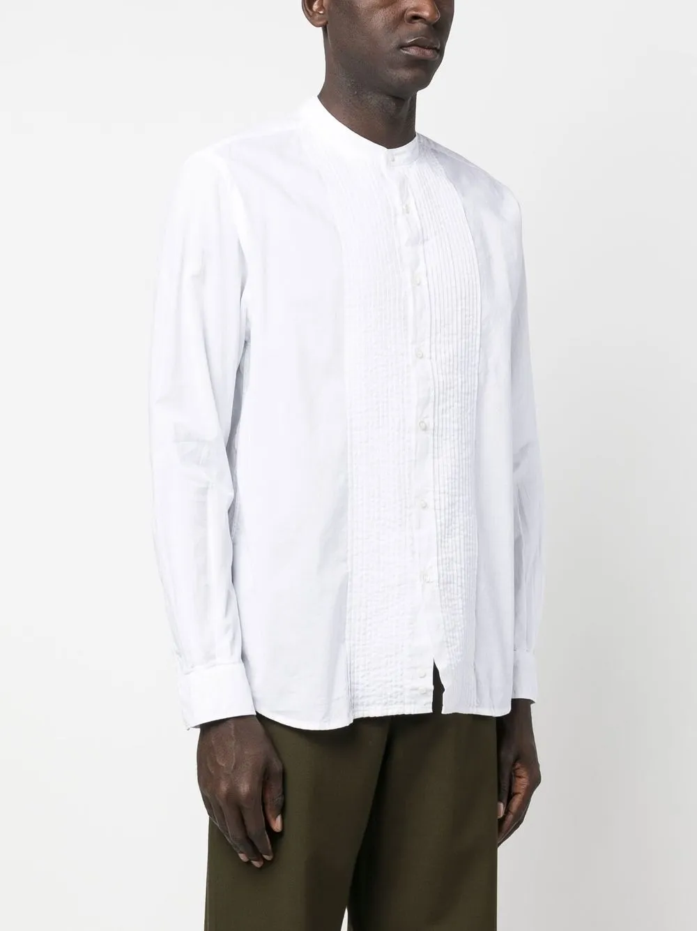 Белый, хлопок, вытачки, воротник-стойка, застежка на пуговицах спереди, длинные рукава, манжеты на пуговицах и закругленный подол.