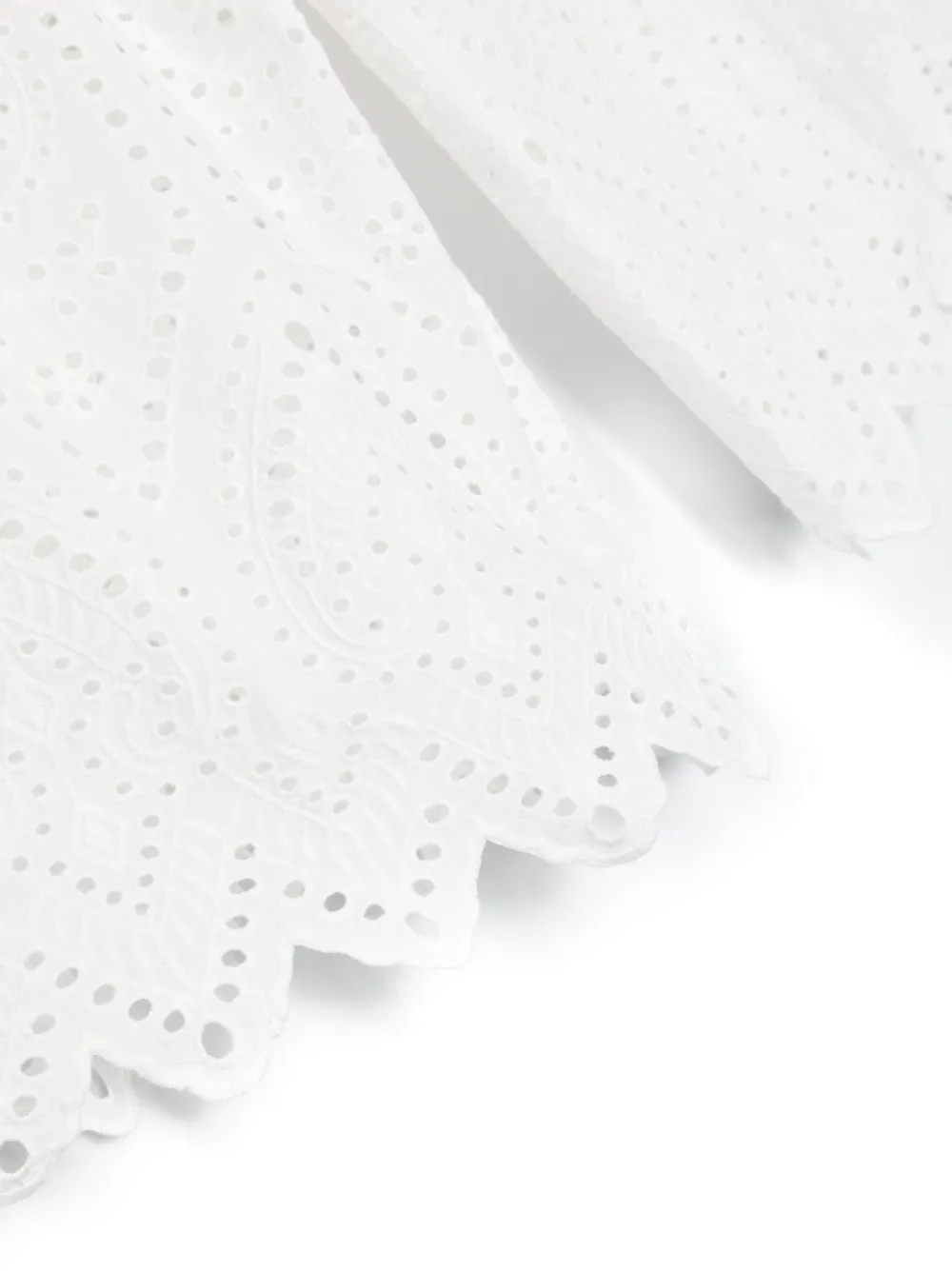 Белый, хлопок, серебристый металлический логотип, расклешенный крой, отделка с вырезами, сборка на талии и укороченная длина.