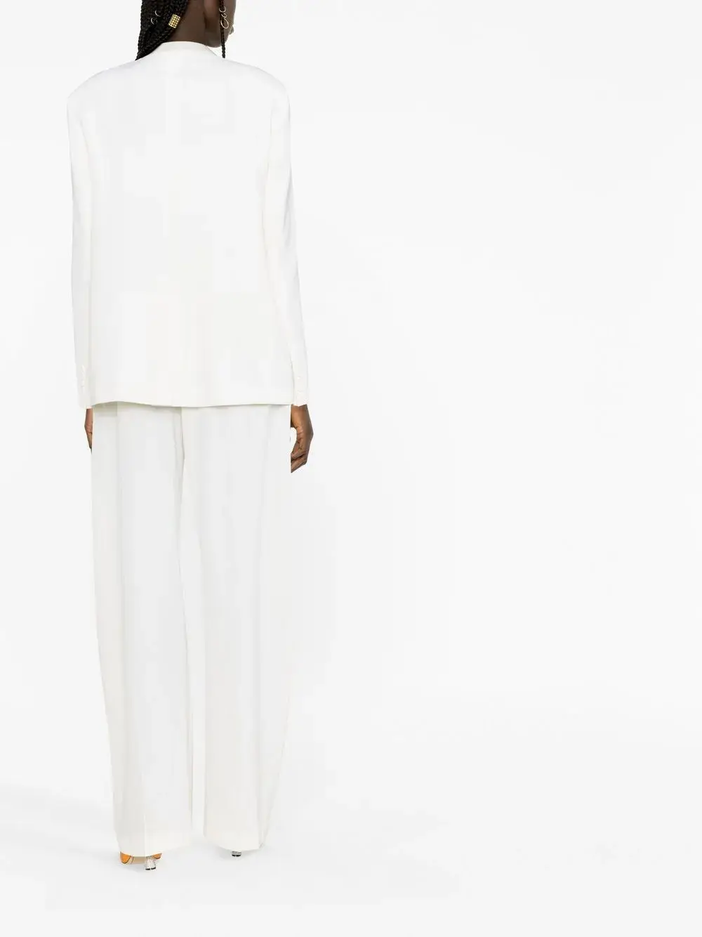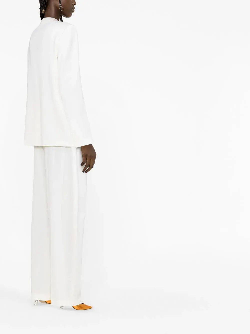 Молочно-белый, смесовая необработанная шерсть, шелк, зазубренные лацканы, застежка на пуговицах спереди, два передних кармана с клапанами, длинные рукава и манжеты на пуговицах.