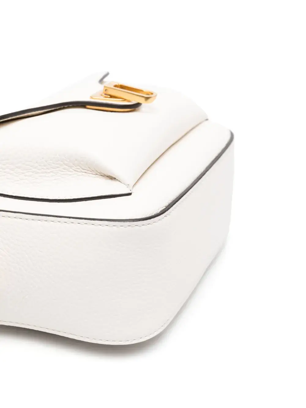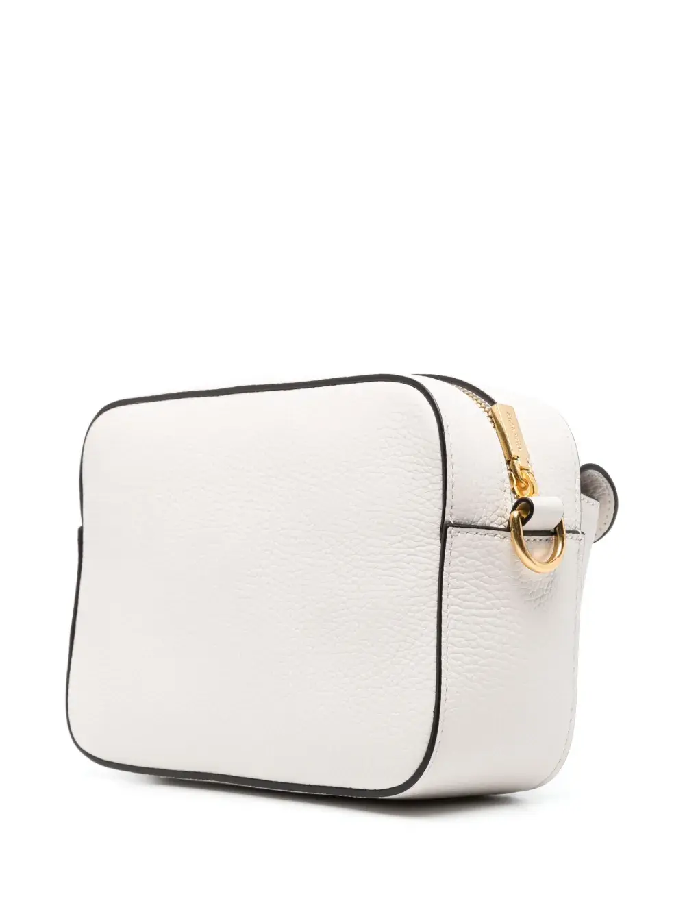 Белый, телячья кожа, зернистая текстура, тисненый логотип спереди, золотистая фурнитура, застежка на молнии сверху, съемный регулируемый ремень на плечо, карман-муфта, застежка с поворачивающимся замком, основное отделение и внутренний карман на молнии.