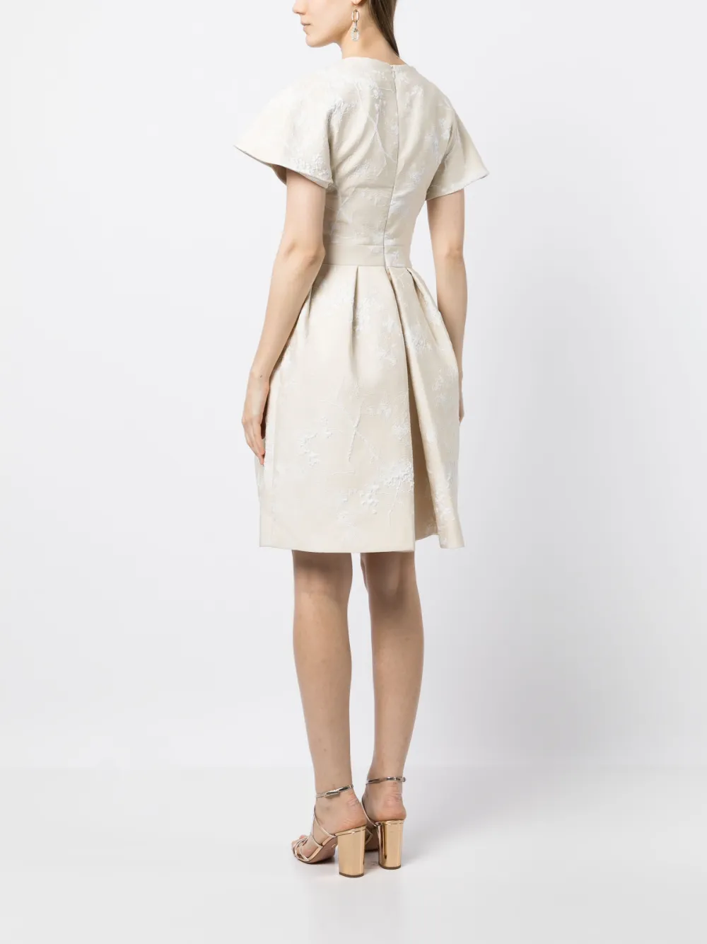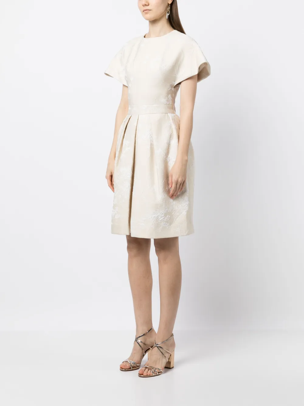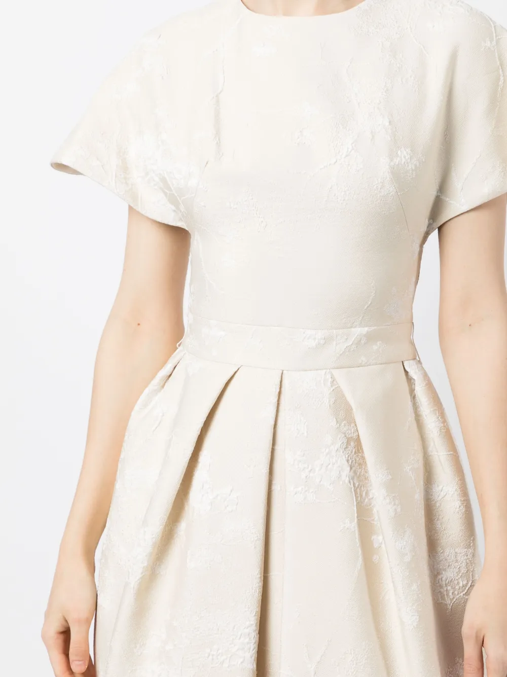 Кремово-белый, парчовая ткань, складки, приталенный силуэт, круглый вырез, короткие рукава и длина по колено.