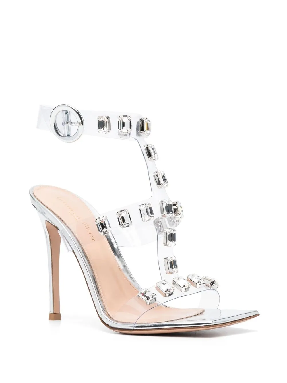 Серебристый, телячья кожа, прозрачный материал, декор из кристаллов, ремешок на щиколотке с пряжкой, квадратный носок, открытый носок, каблук на высокой шпильке и кожаная стелька с логотипом.