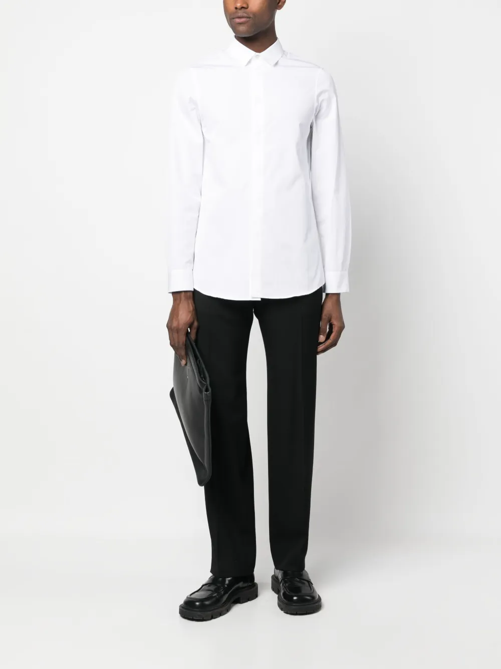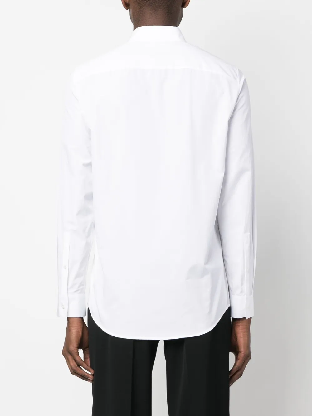 Белый, хлопок, отложной воротник, потайная пуговичная застежка спереди, длинные рукава, манжеты на пуговицах и закругленный подол.