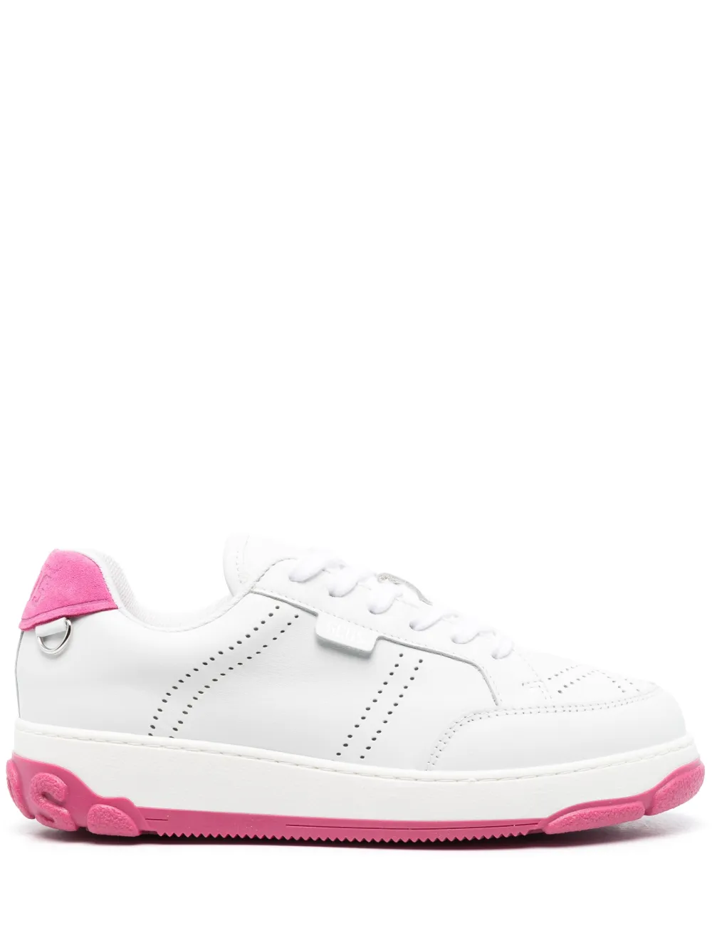Белый, розовый, телячья кожа, перфорация, шнуровка спереди, закругленный носок и плоская резиновая подошва.