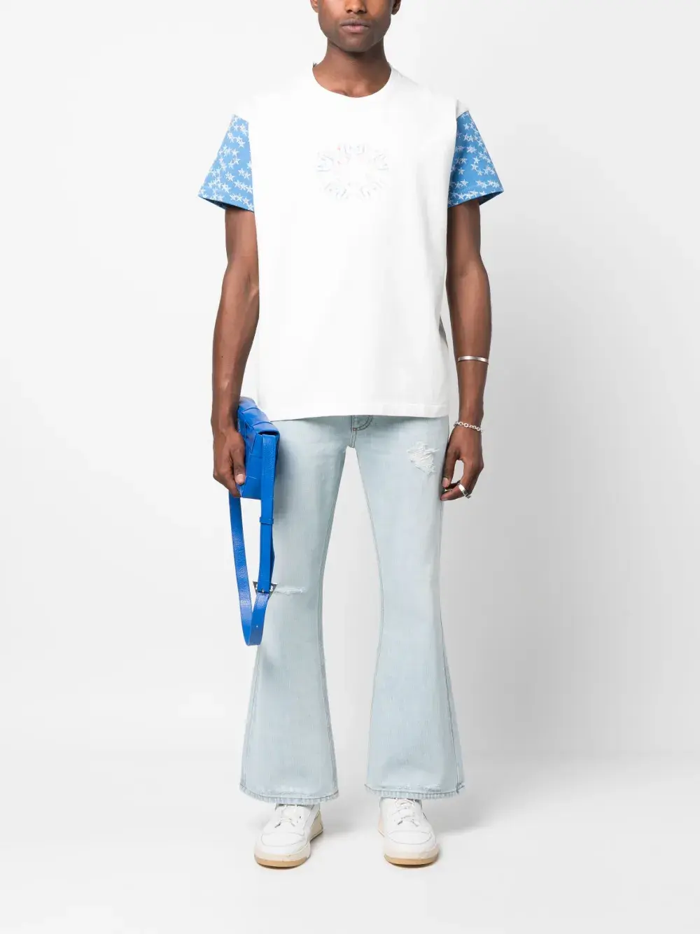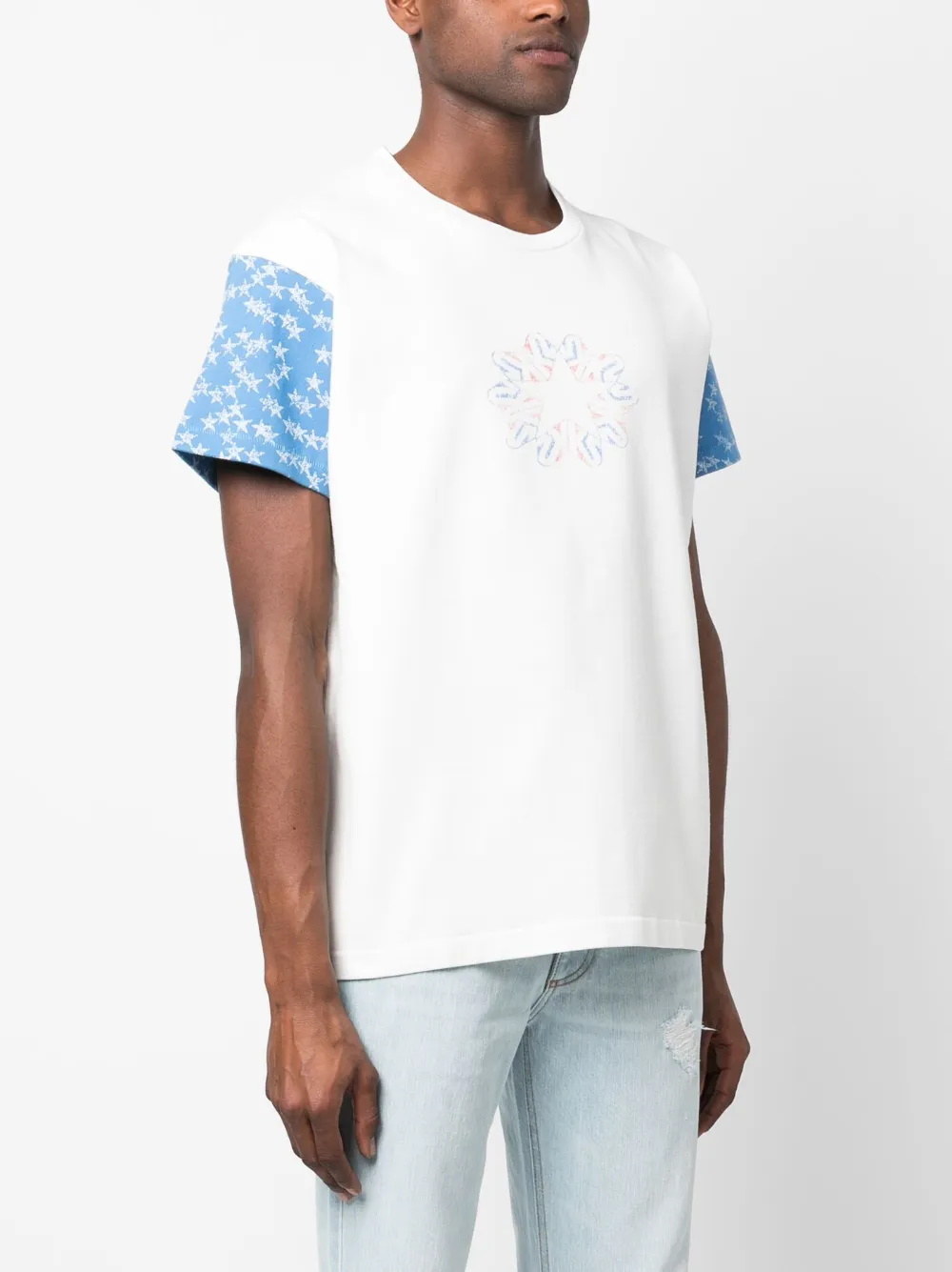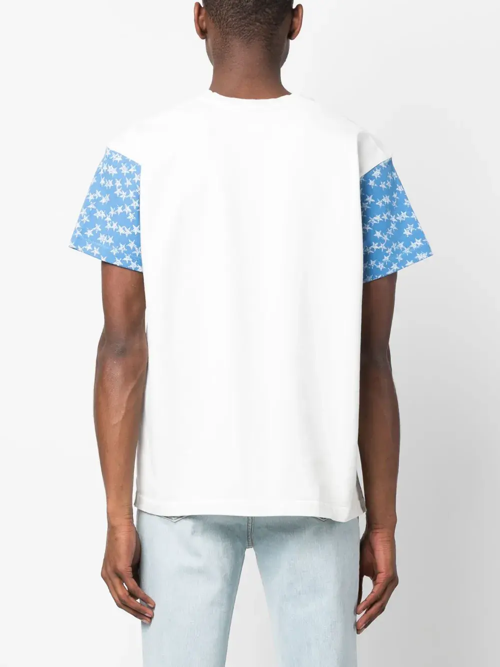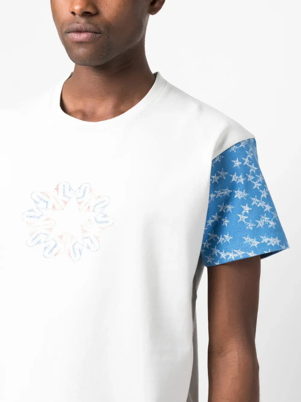 Белый, синий, хлопок, принт с изображением звезд, принт на груди, рукава с графичным принтом, круглый вырез, короткие рукава и прямой подол.