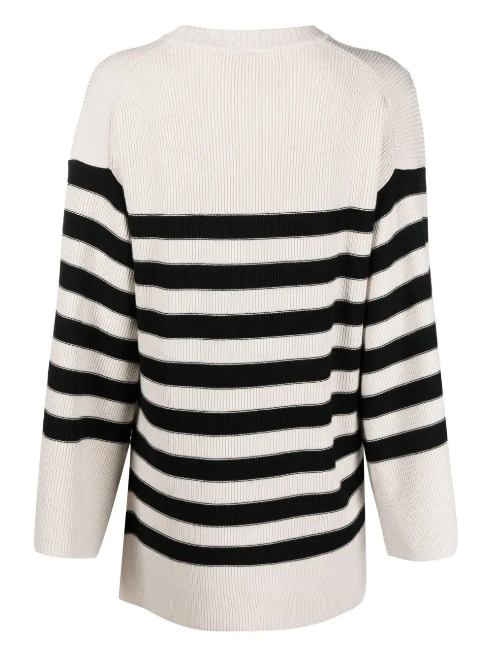 Белый/черный, смесовая шерсть мериноса, трикотаж в рубчик, принт в горизонтальную полоску, круглый вырез, длинные широкие рукава и прямой подол.