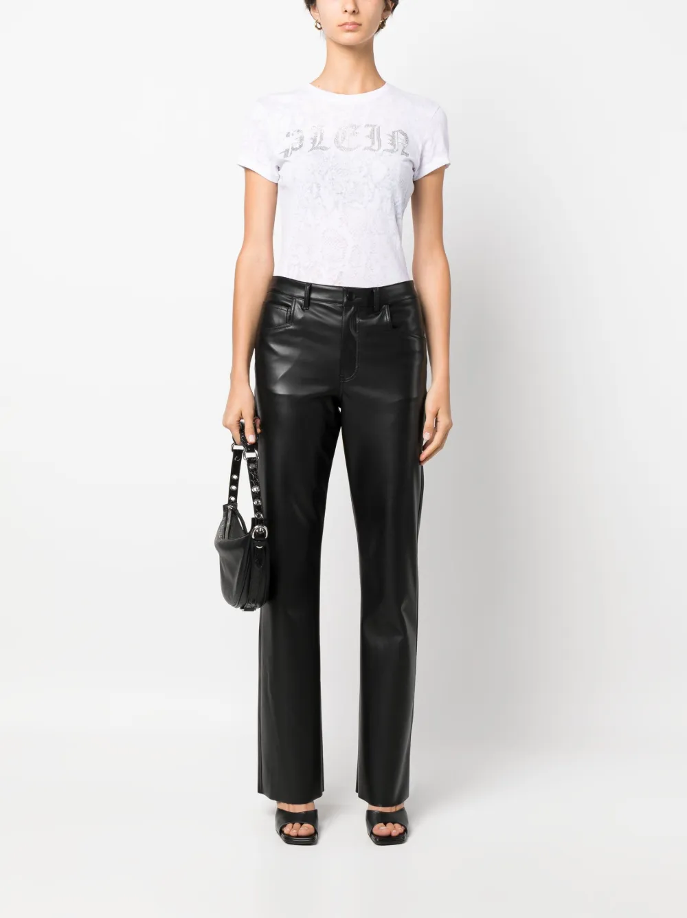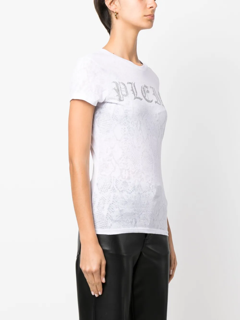Белый, хлопок, змеиный принт, украшения из горного хрусталя, логотип спереди, круглый вырез, короткие рукава и прямой подол.