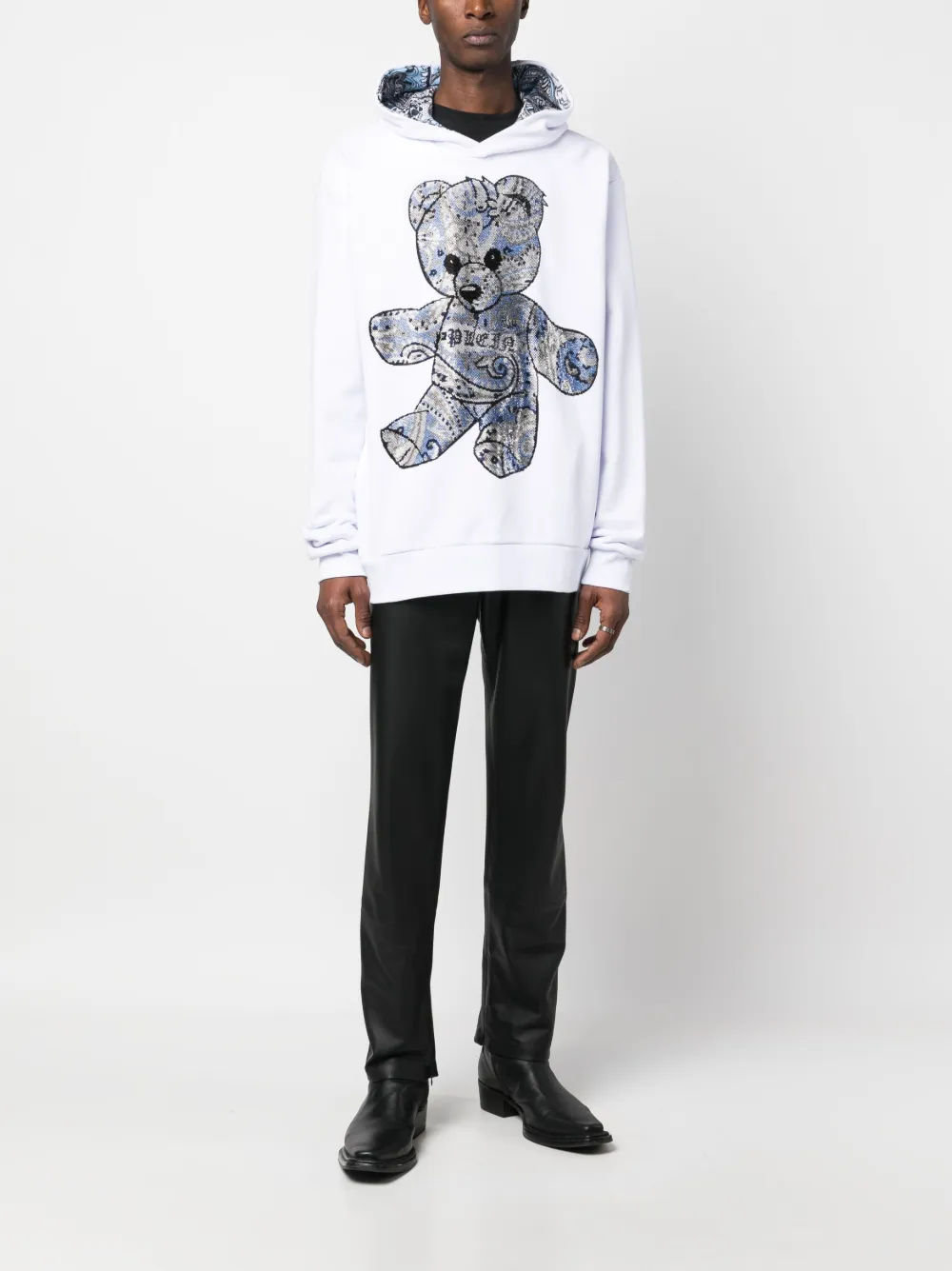 Белый, украшения из горного хрусталя, принт с изображением плюшевого медведя, принт пейсли, длинные рукава, объемный капюшон и прямой подол.