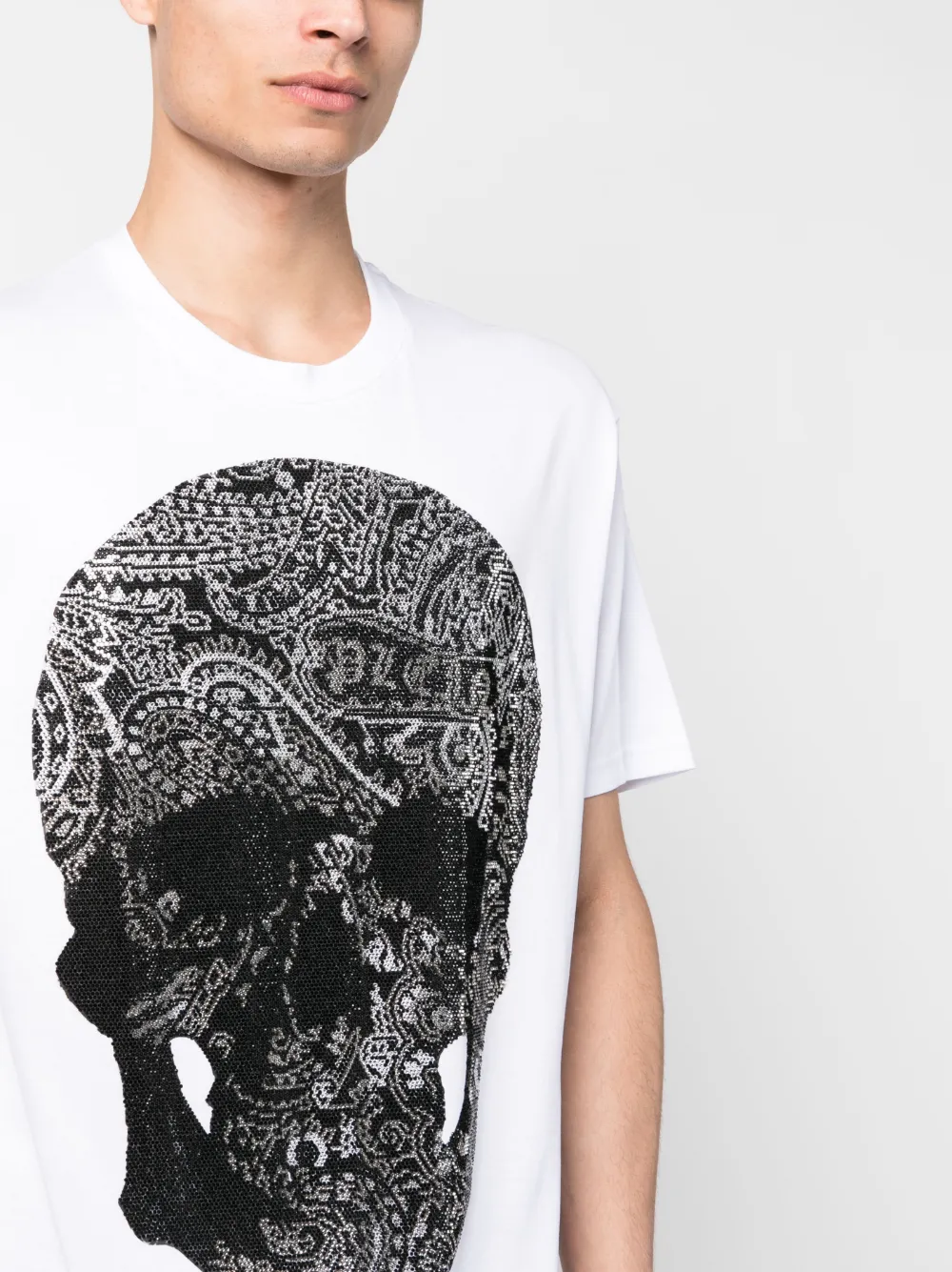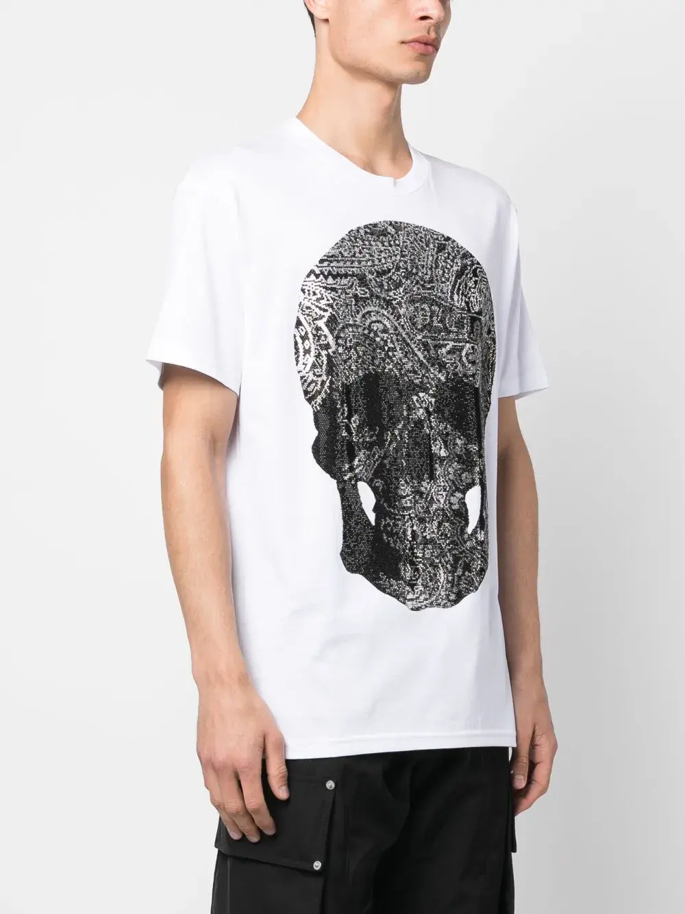 Белый/черный, хлопок, нашивка с логотипом сбоку, принт с изображением черепа, круглый вырез, короткие рукава и прямой подол.