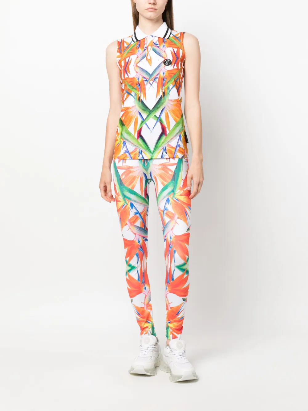 Белый/разноцветный, хлопок, сплошной цветочный принт, принт с логотипом сзади, нашивка с логотипом сбоку, металлический логотип, полоски, воротник поло, планка на пуговицах спереди, без рукавов и прямой подол.