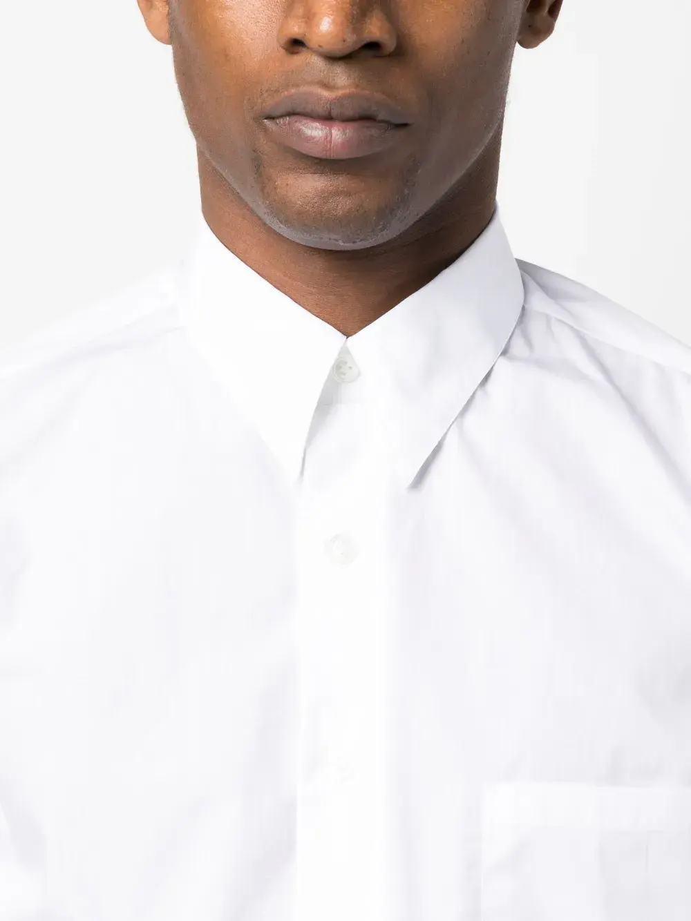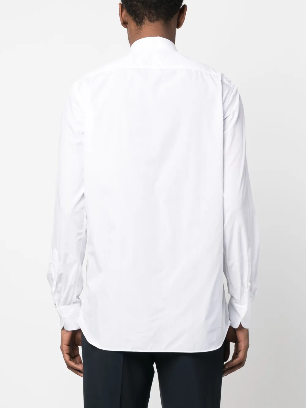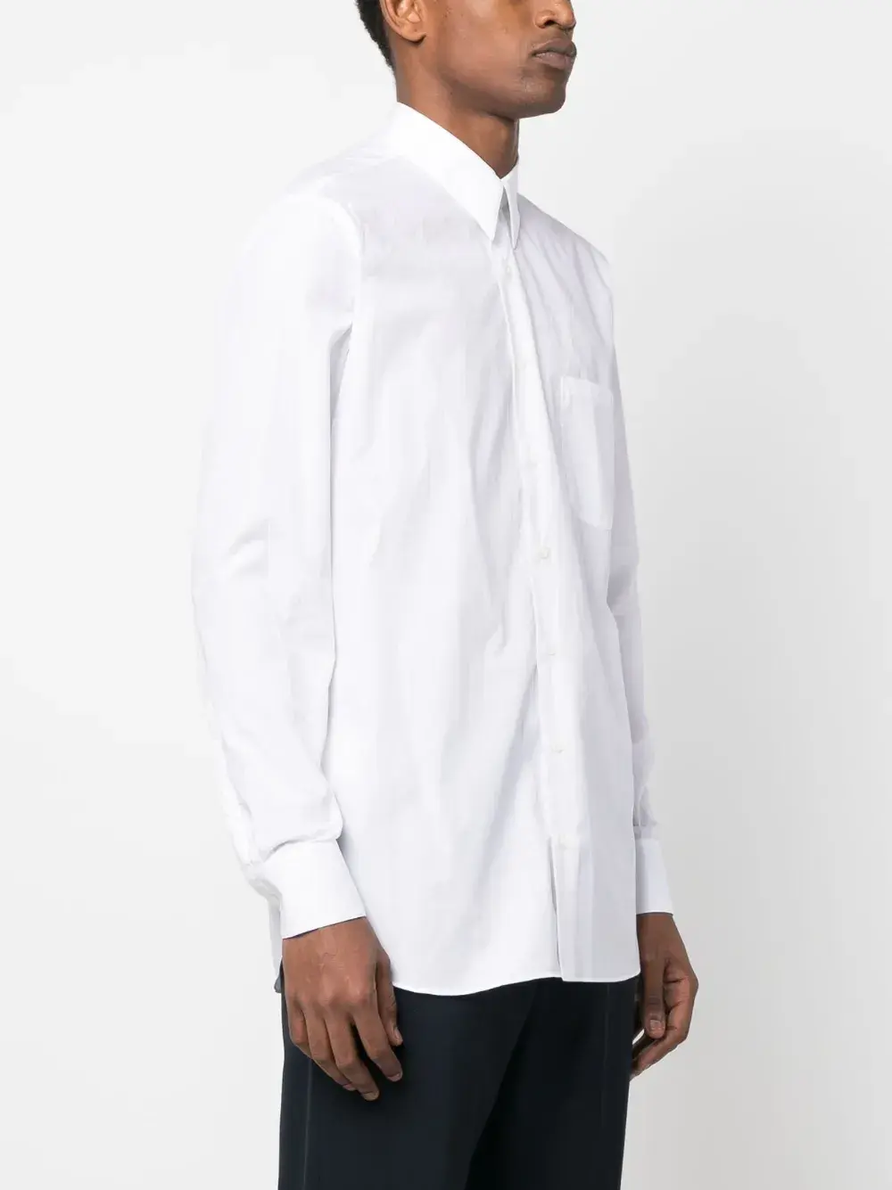 Молочно-белый, хлопок, классический воротник, застежка на пуговицах спереди, длинные рукава, рукава с манжетами на пуговицах и закругленный подол.