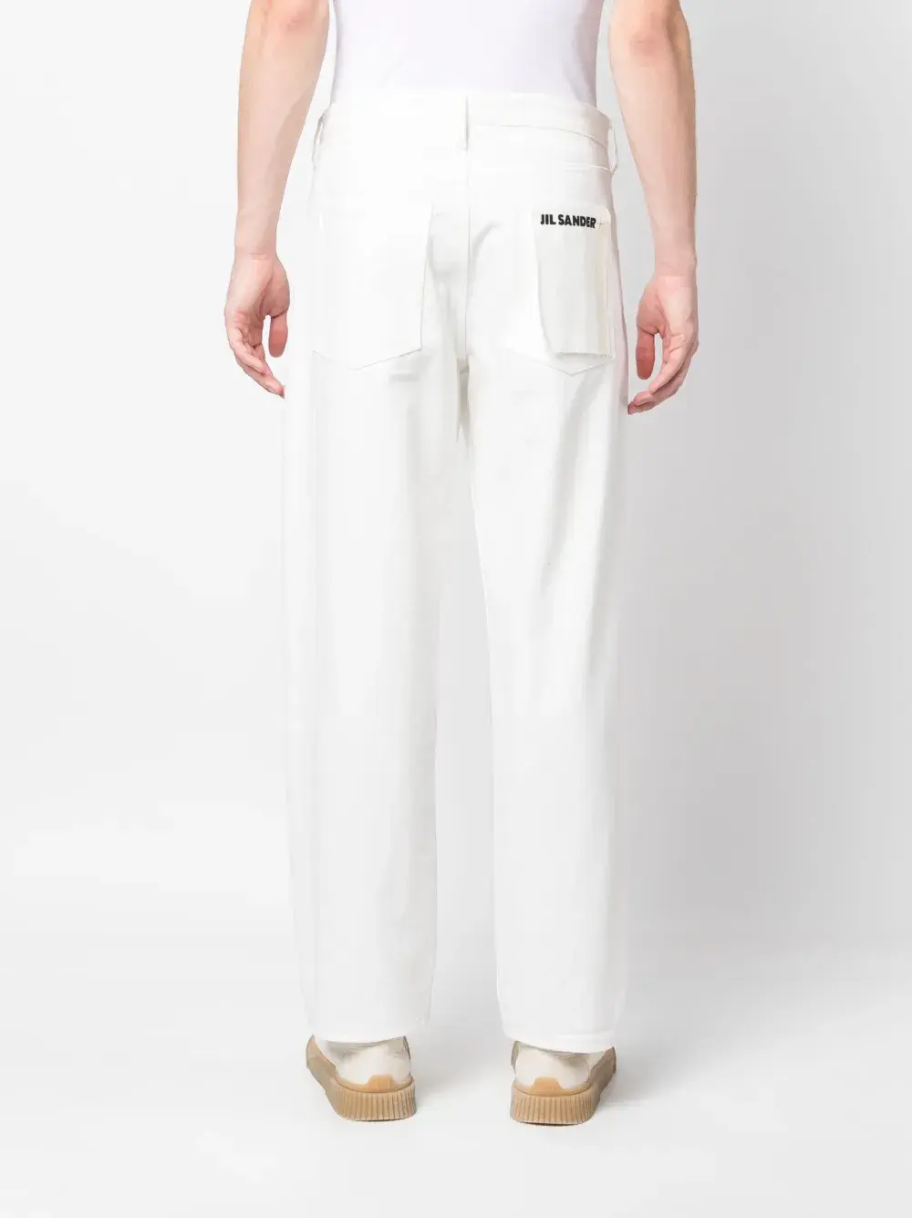 Молочно-белый, хлопок, петли для ремня, принт с логотипом сзади, потайная пуговичная застежка спереди, пять карманов, прямой крой и высота по щиколотку.