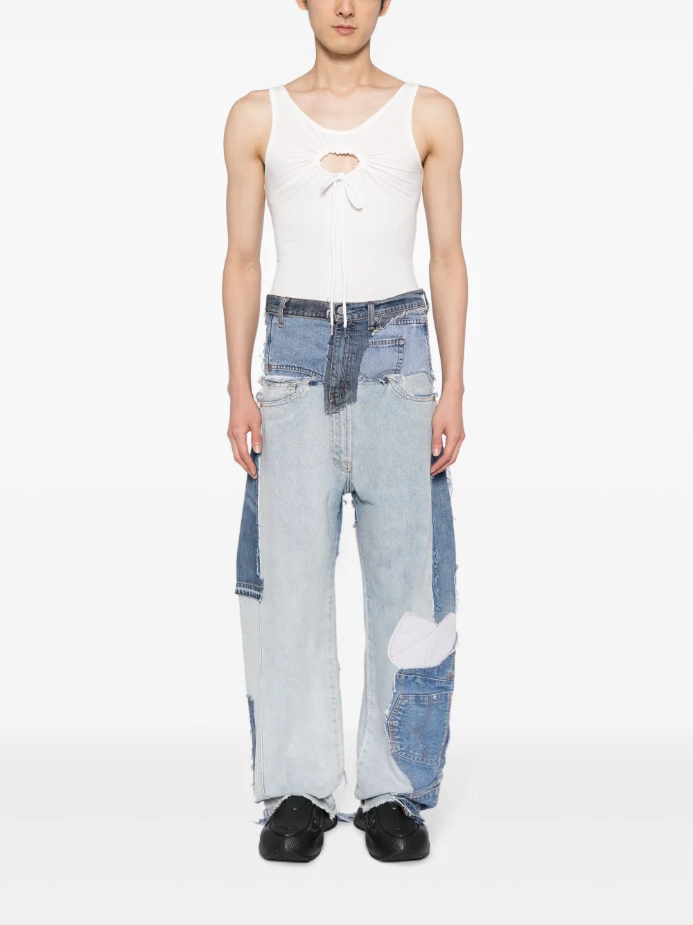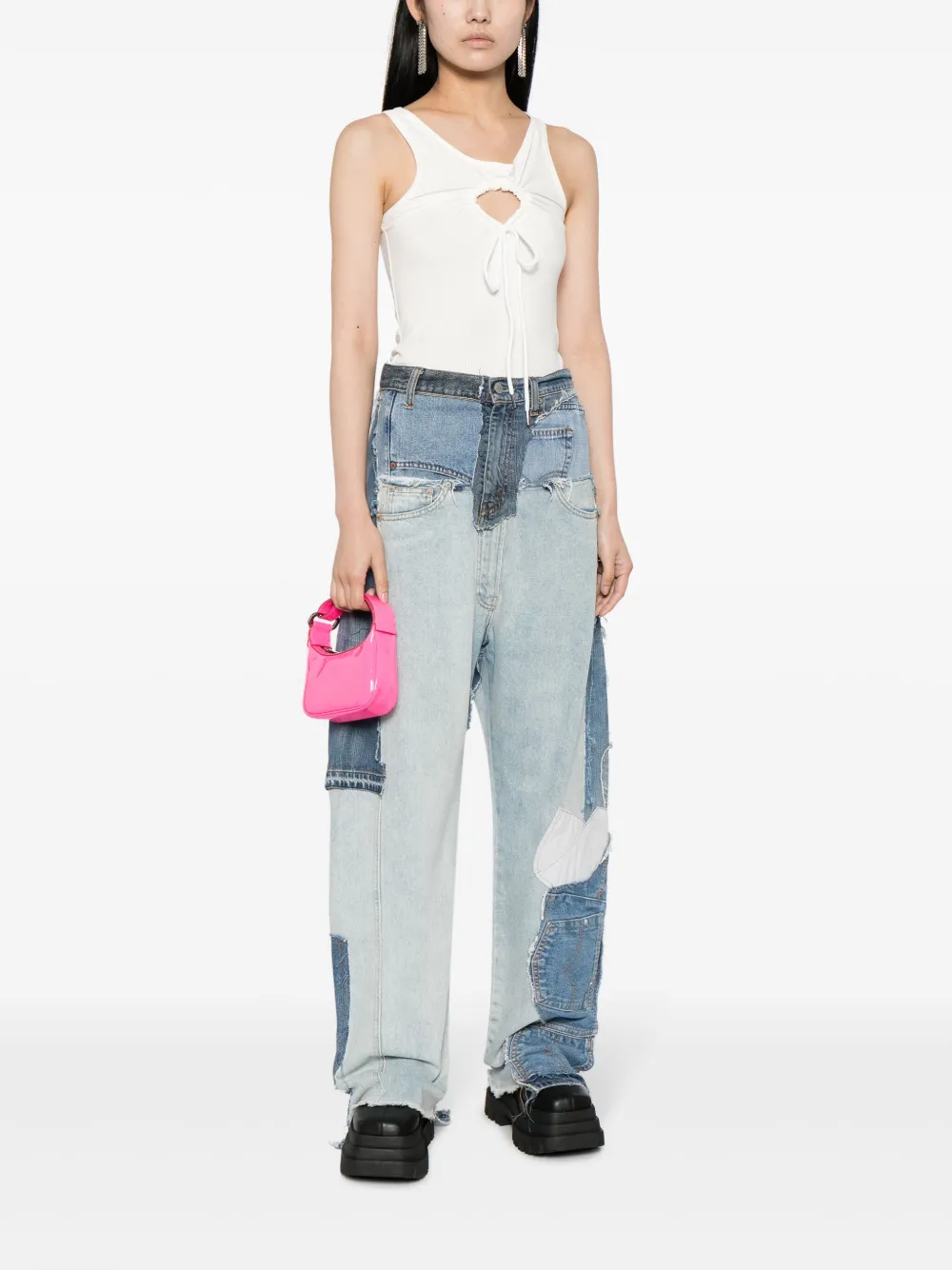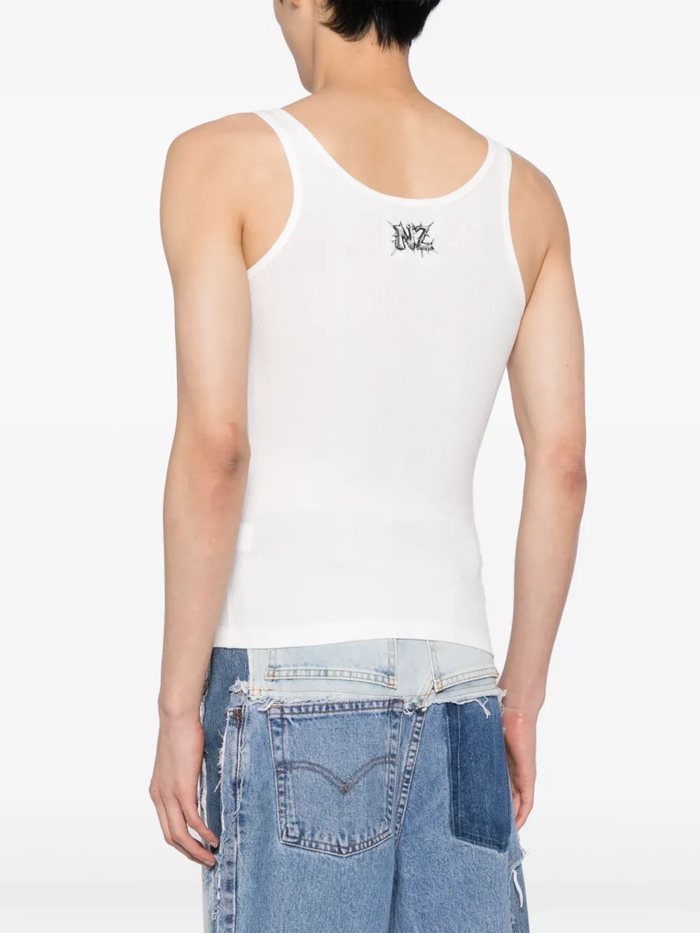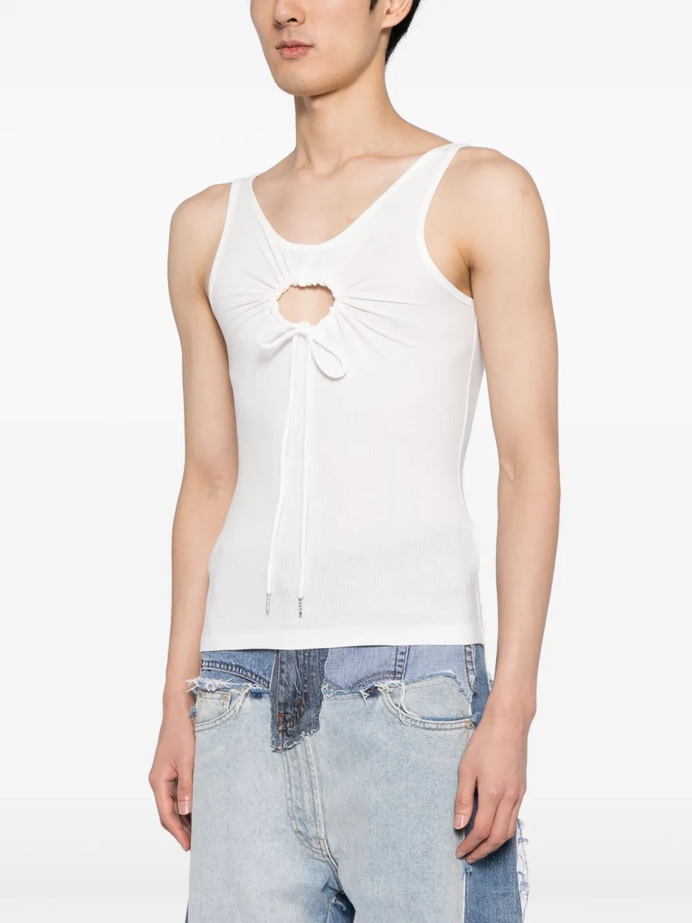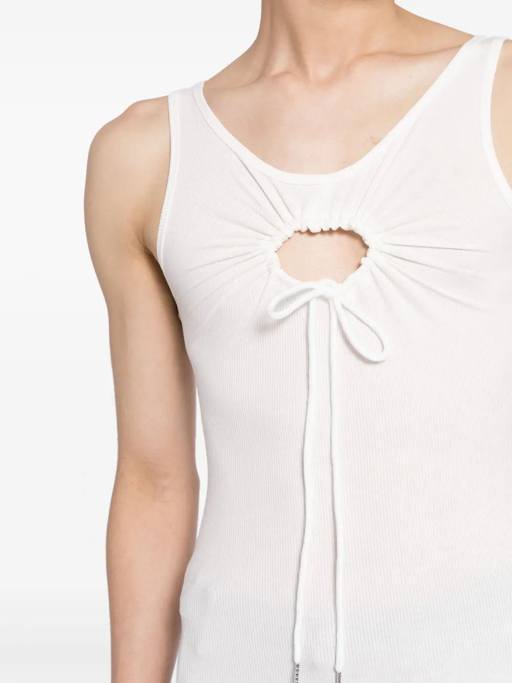Белый, эластичный материал, ткань в мелкий рубчик, U-образный вырез, вырезные детали, дизайн со сборками, кулиска, U-образный вырез на спине и прямой подол.