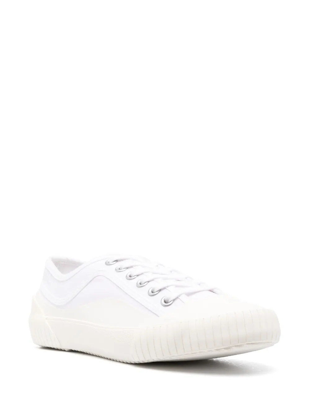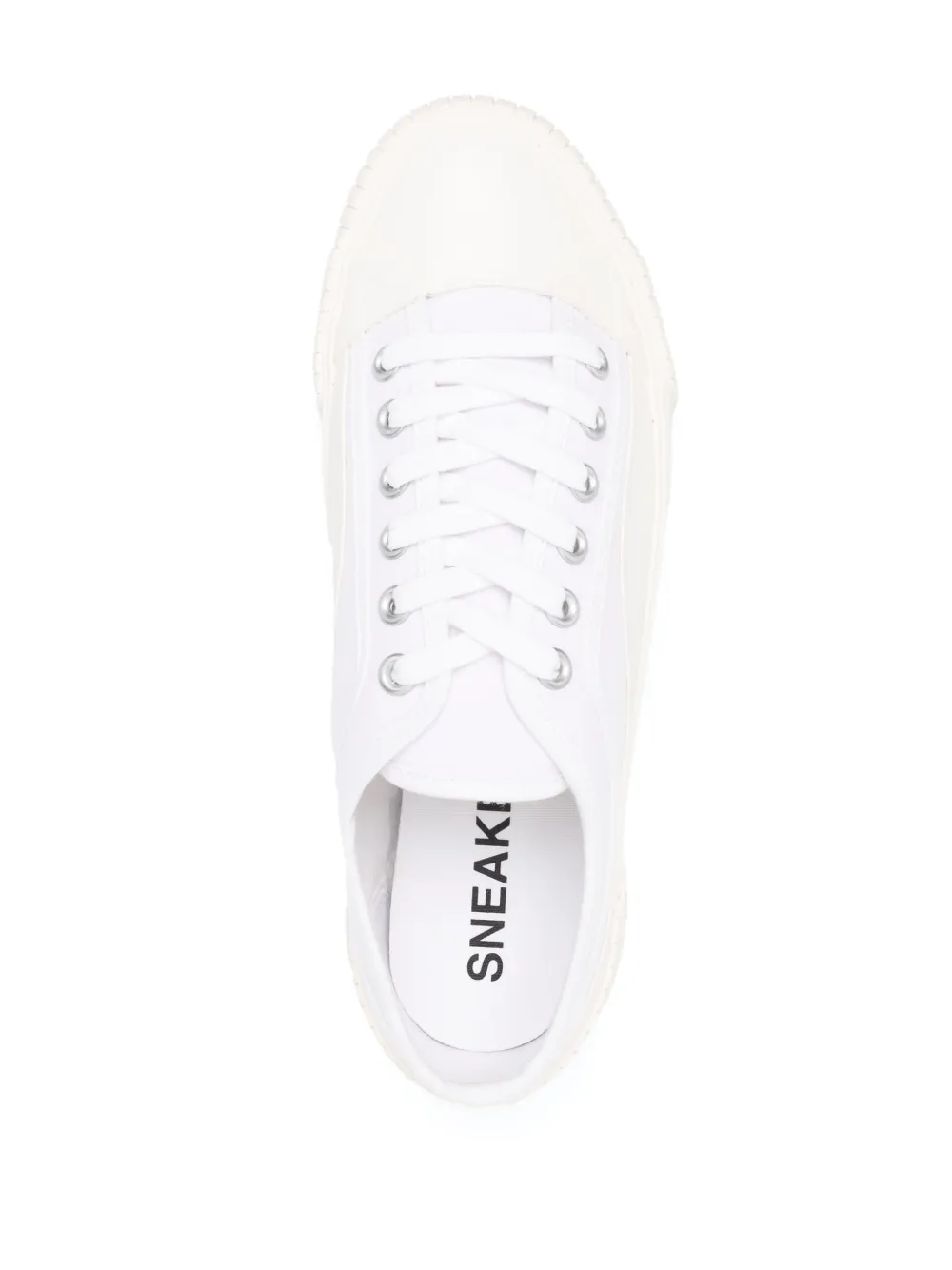Белый, парусина, вышитый логотип сзади, шнуровка спереди, миндалевидный носок и плоская резиновая подошва.
