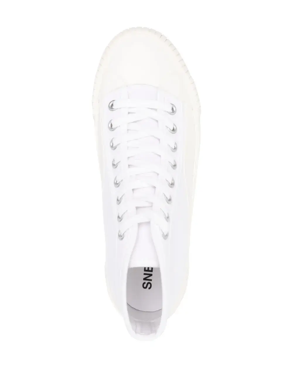 Белый, парусина, строчка в тон, шнуровка спереди, миндалевидный носок, стелька с логотипом и плоская резиновая подошва.