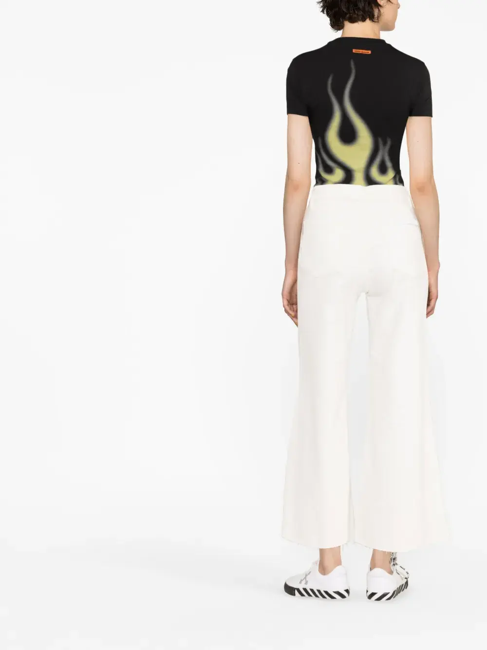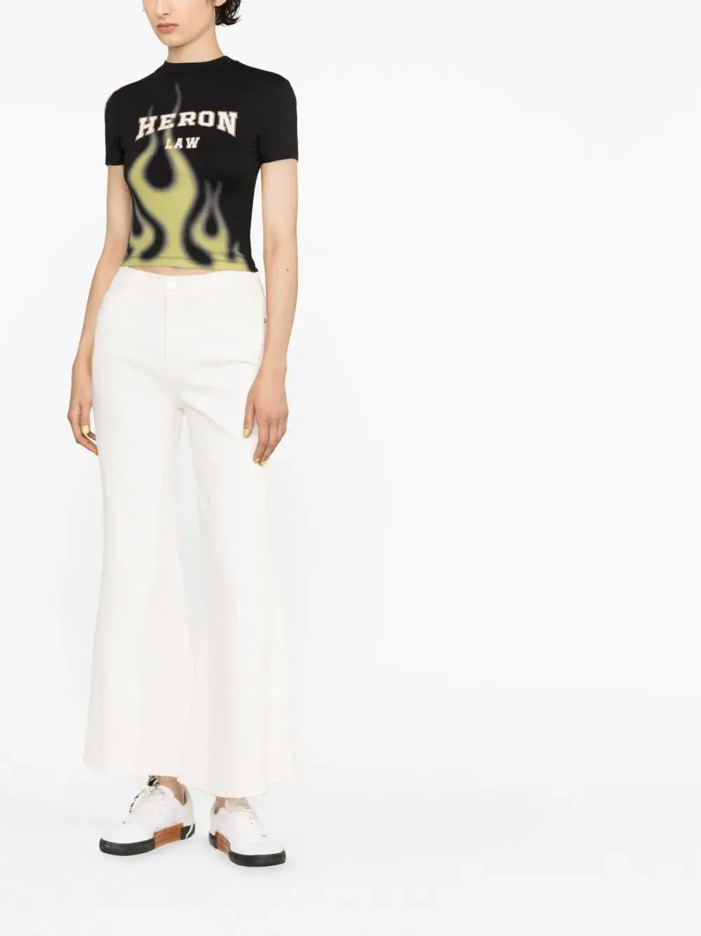 Кремовый, эластичный хлопок, деним, расклешенный крой, укороченная длина, застежка на молнии и пуговице спереди и пять карманов.