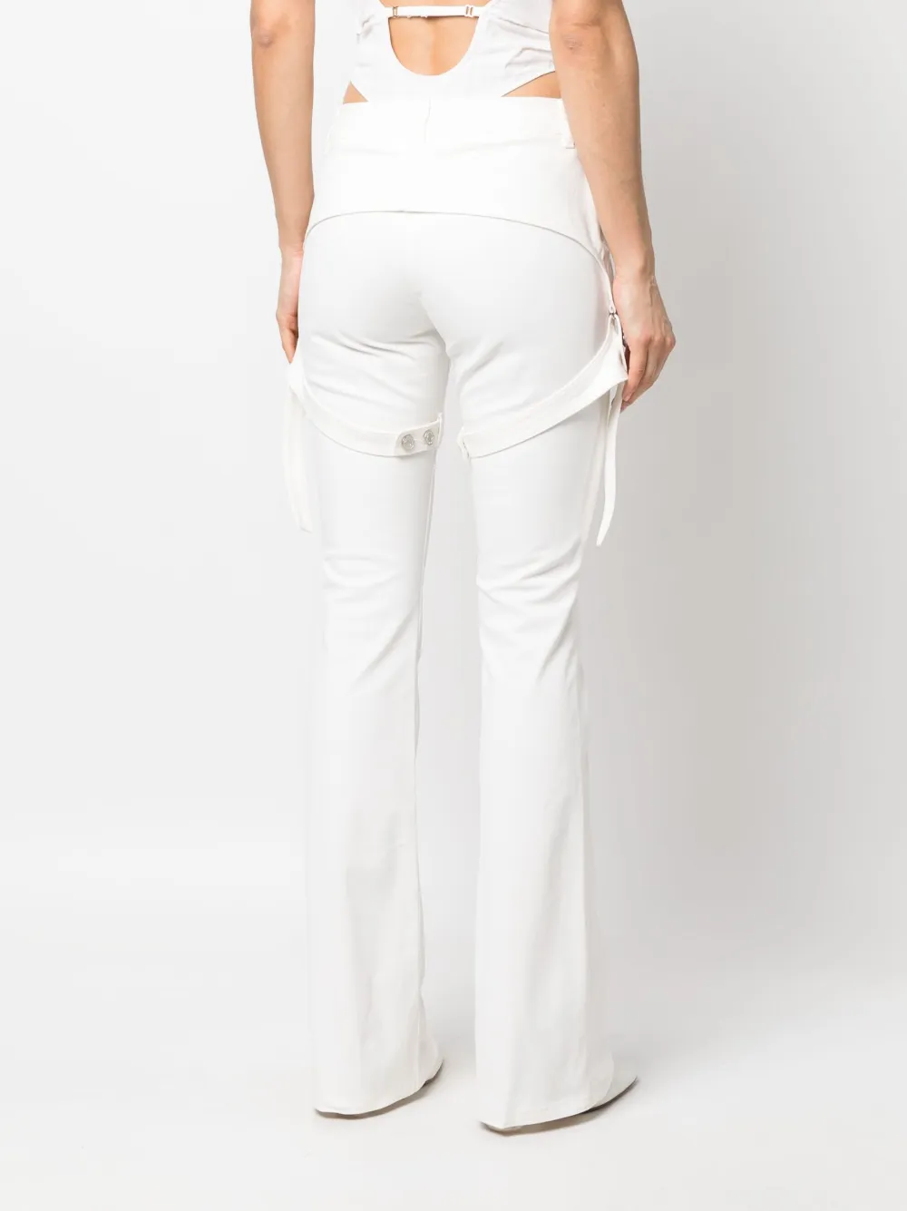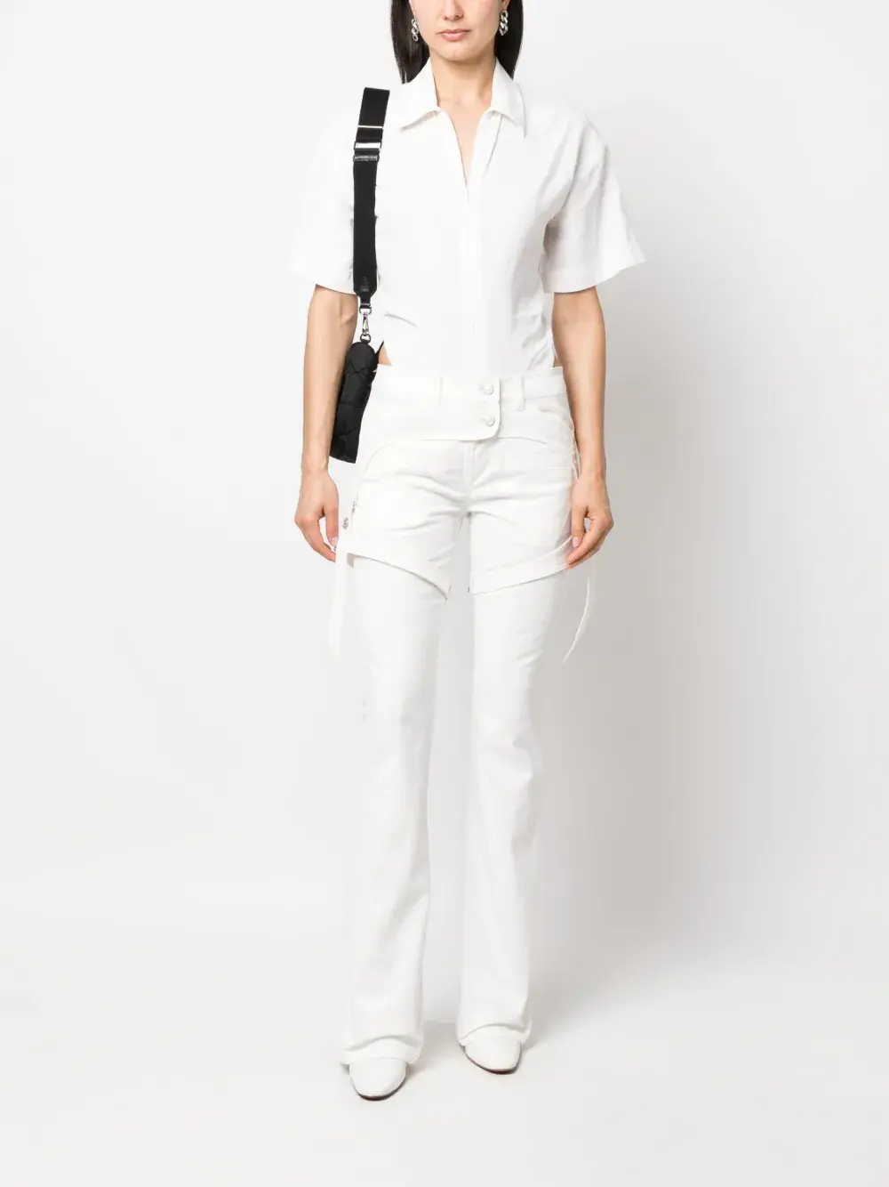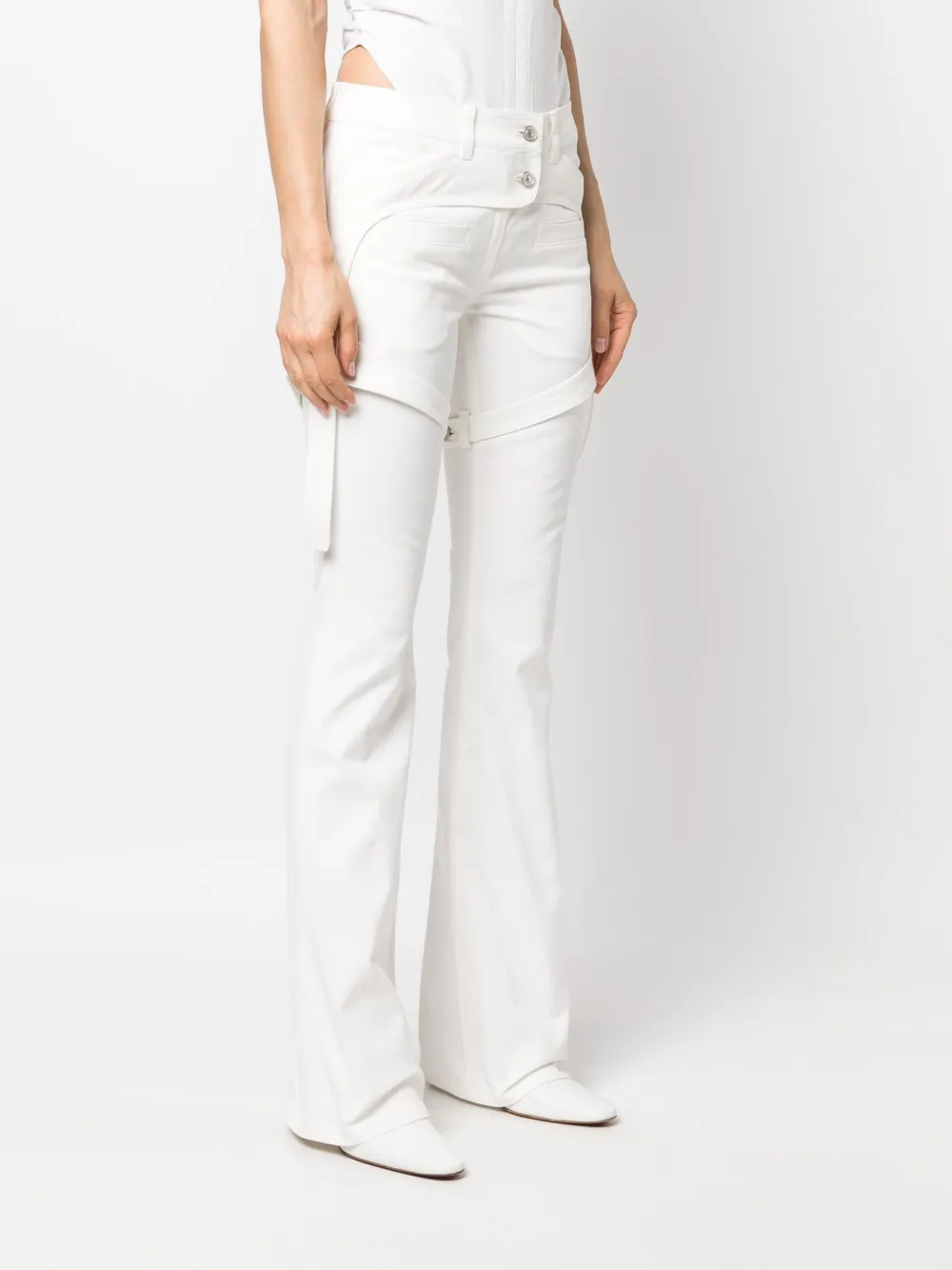 Кремовый, эластичный хлопок, пять карманов, петли для ремня и прямой крой.