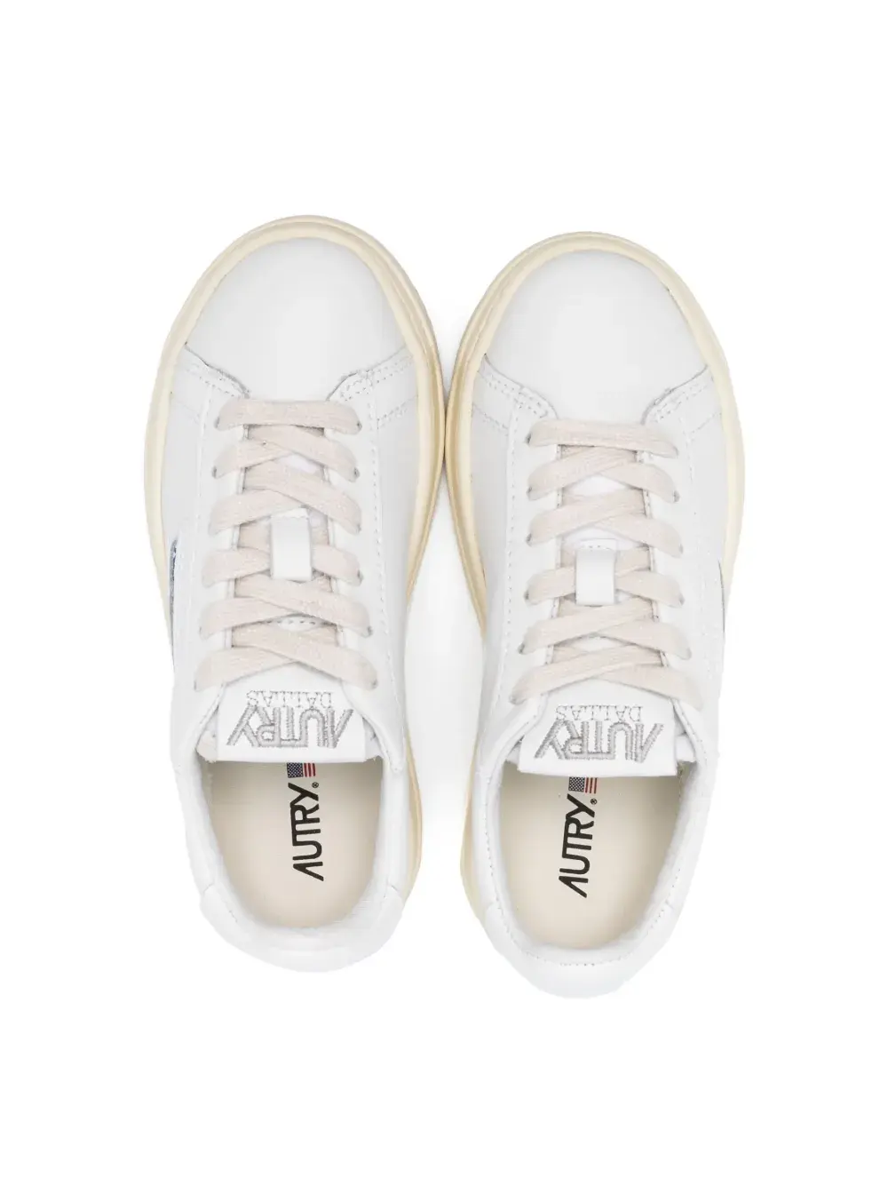Белый, телячья кожа, нашивка с логотипом на язычке, стелька с логотипом, закругленный носок, шнуровка спереди и плоская резиновая подошва.