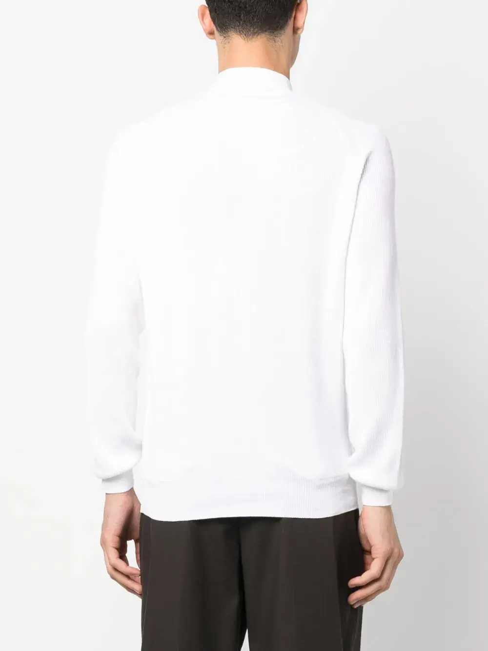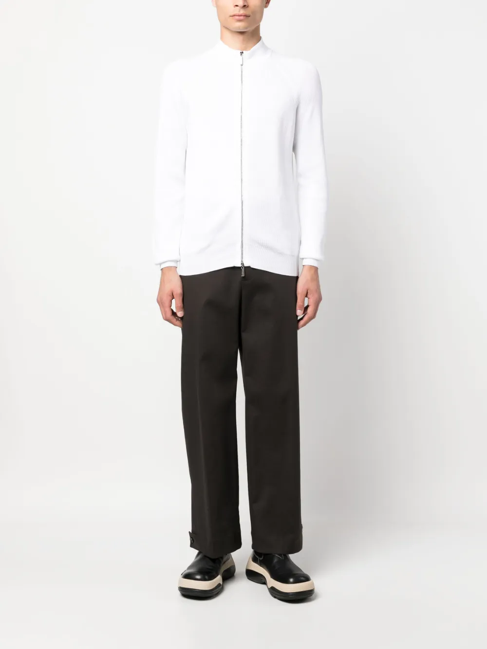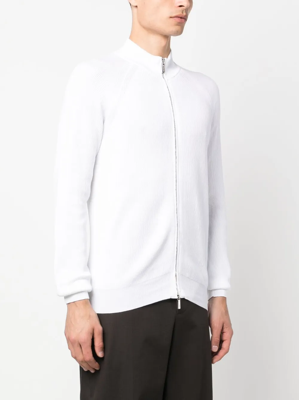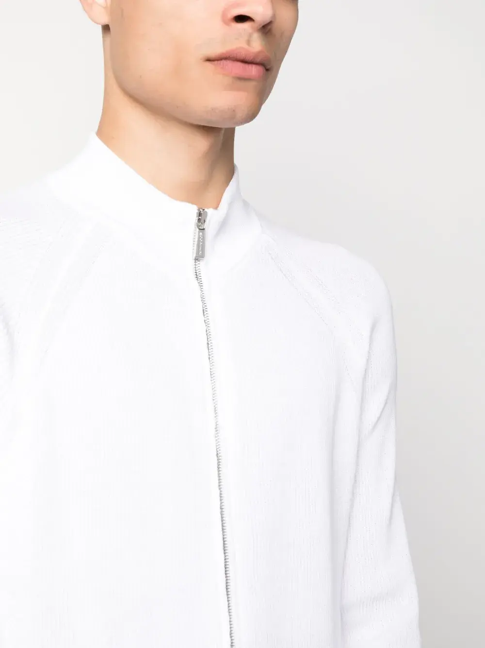 Белый, хлопок, трикотаж в рубчик, двусторонняя молния спереди, длинные рукава и воротник-стойка в рубчик.