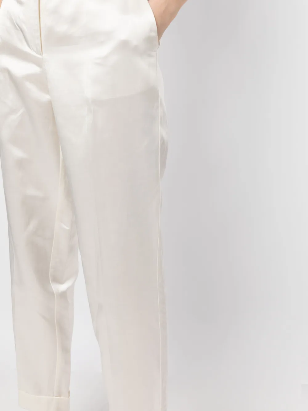 Ванильно-белый, смесовый лен, сатиновая фактура, средняя посадка, стрелки, застежка на молнии и пуговице спереди, два вшитых кармана по бокам, два кармана с листочкой сзади и подвернутые манжеты.