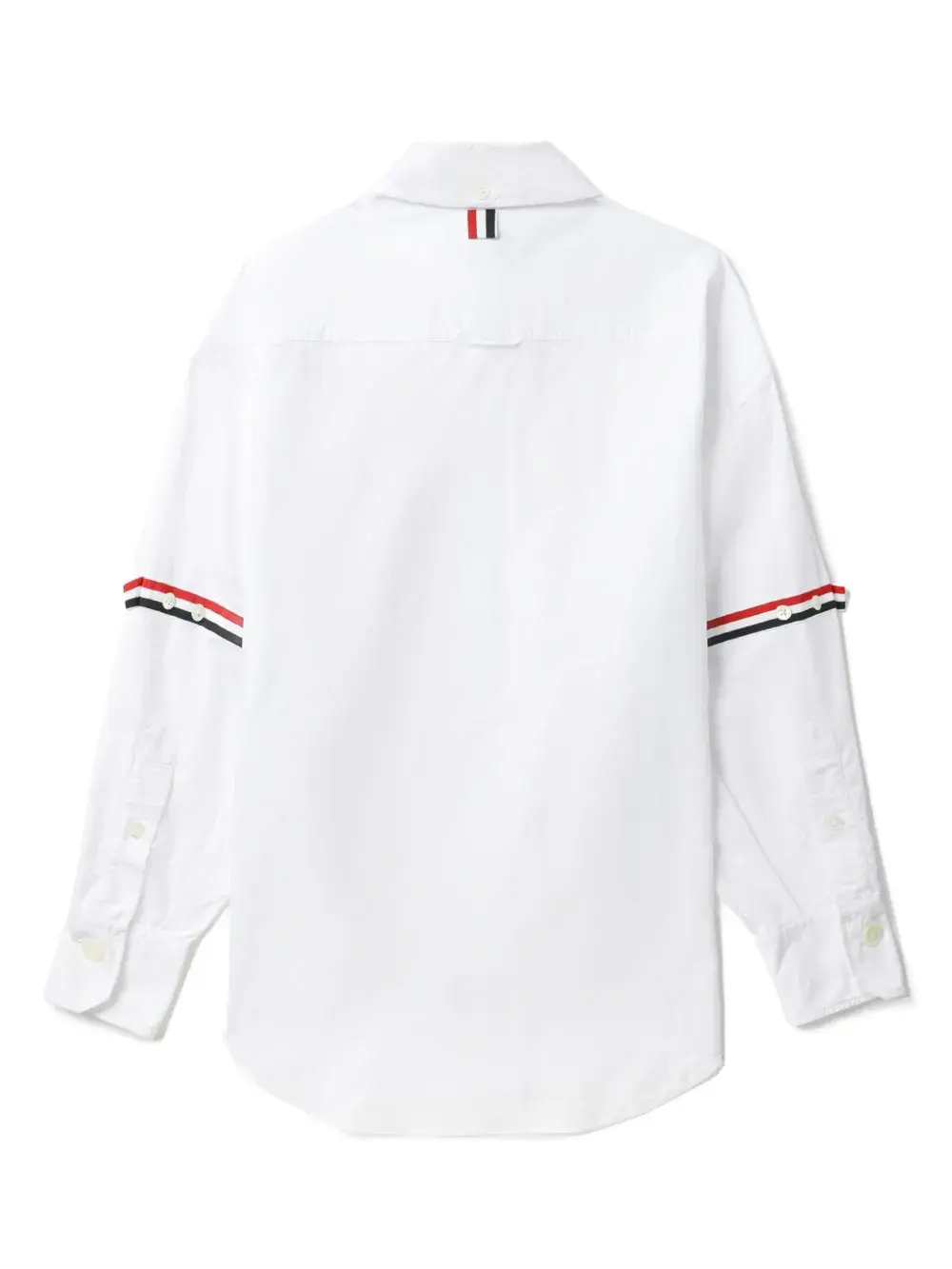 Белый, хлопок, поплин, полоски RWB, нашивка с логотипом спереди, широкий заостренный воротник, планка на пуговицах спереди, нагрудный накладной карман, длинные рукава, манжеты на пуговицах и закругленный подол.