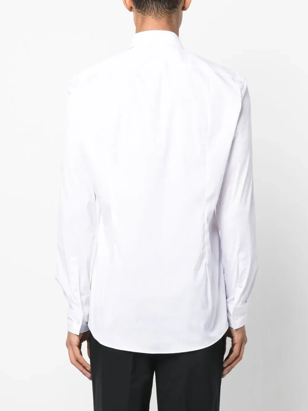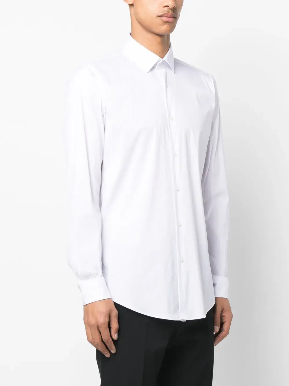 Белый, смесовый хлопок, классический воротник, застежка на пуговицах спереди, длинные рукава, манжеты на пуговицах и закругленный подол.
