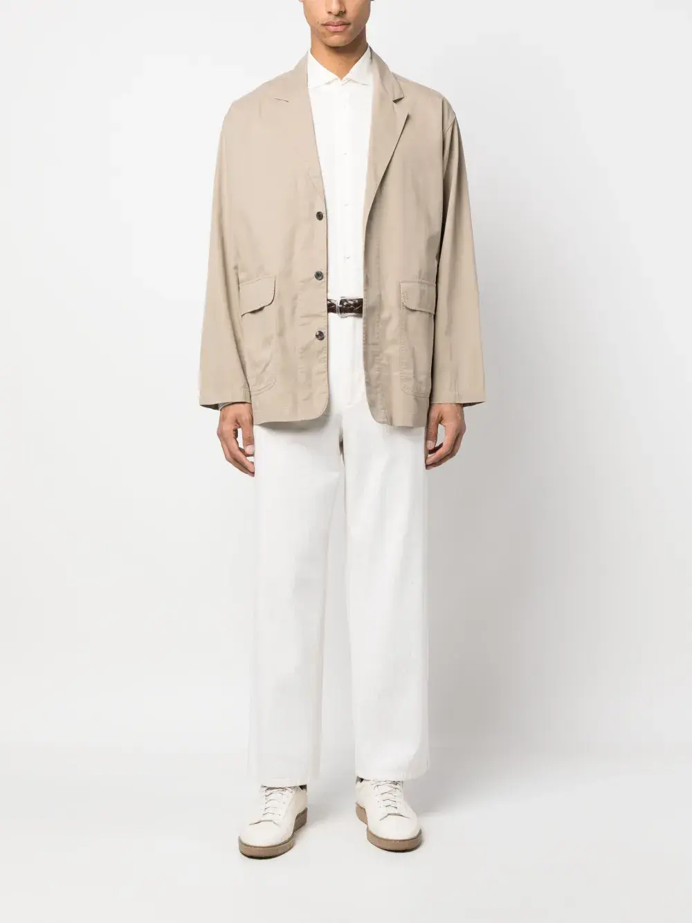 Белый, хлопок, классический воротник, застежка на пуговицах спереди, рукава с манжетами на пуговицах и закругленный подол.