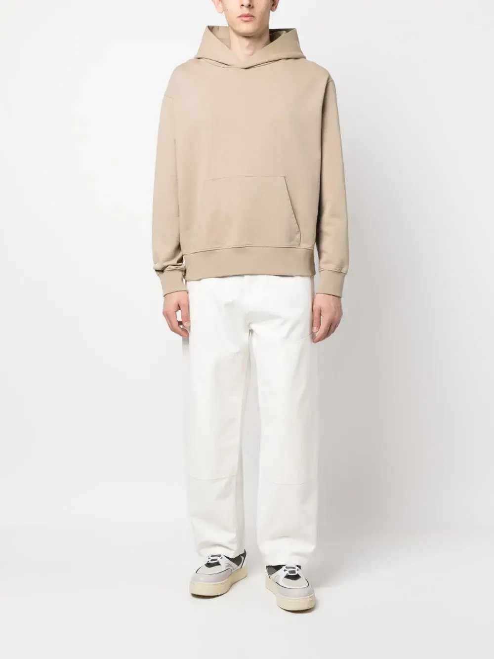 Белый, хлопок, нашивка с логотипом сзади, широкий крой, средняя посадка, контрастные вставки, потайная застежка на молнии и пуговицах, два кармана по бокам, петли для ремня, два накладных кармана сзади и два накладных кармана по бокам.