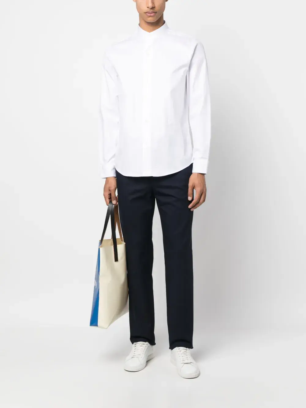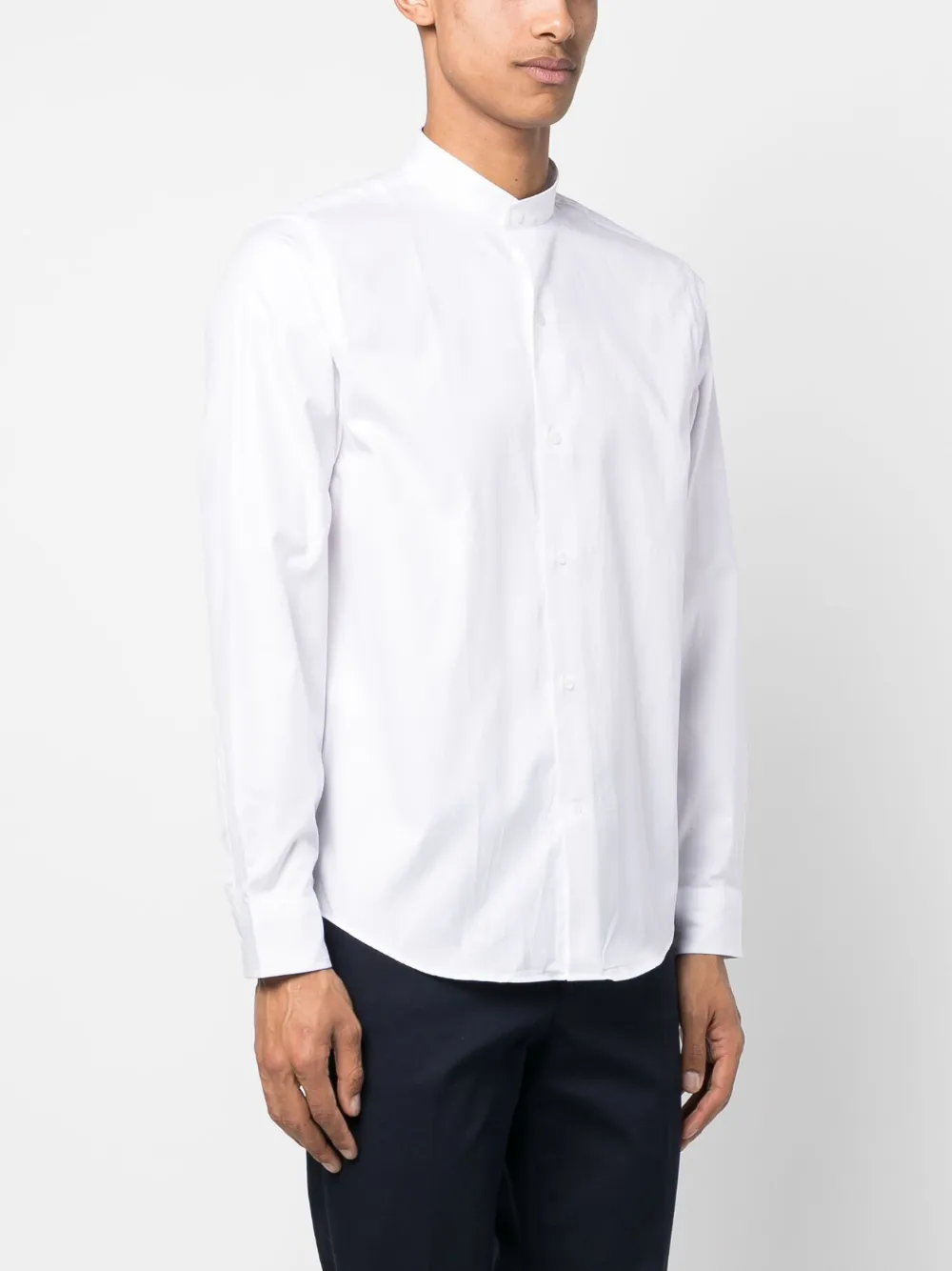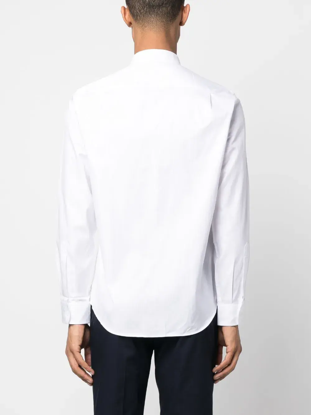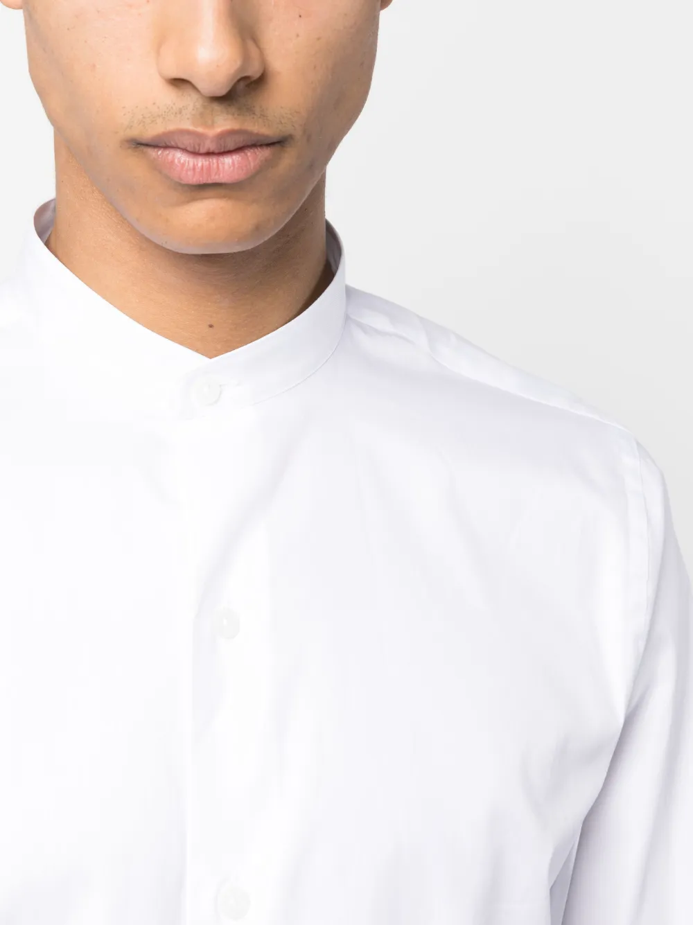 Белый, хлопок, без воротника, застежка на пуговицах спереди, длинные рукава, манжеты на пуговицах и закругленный подол.