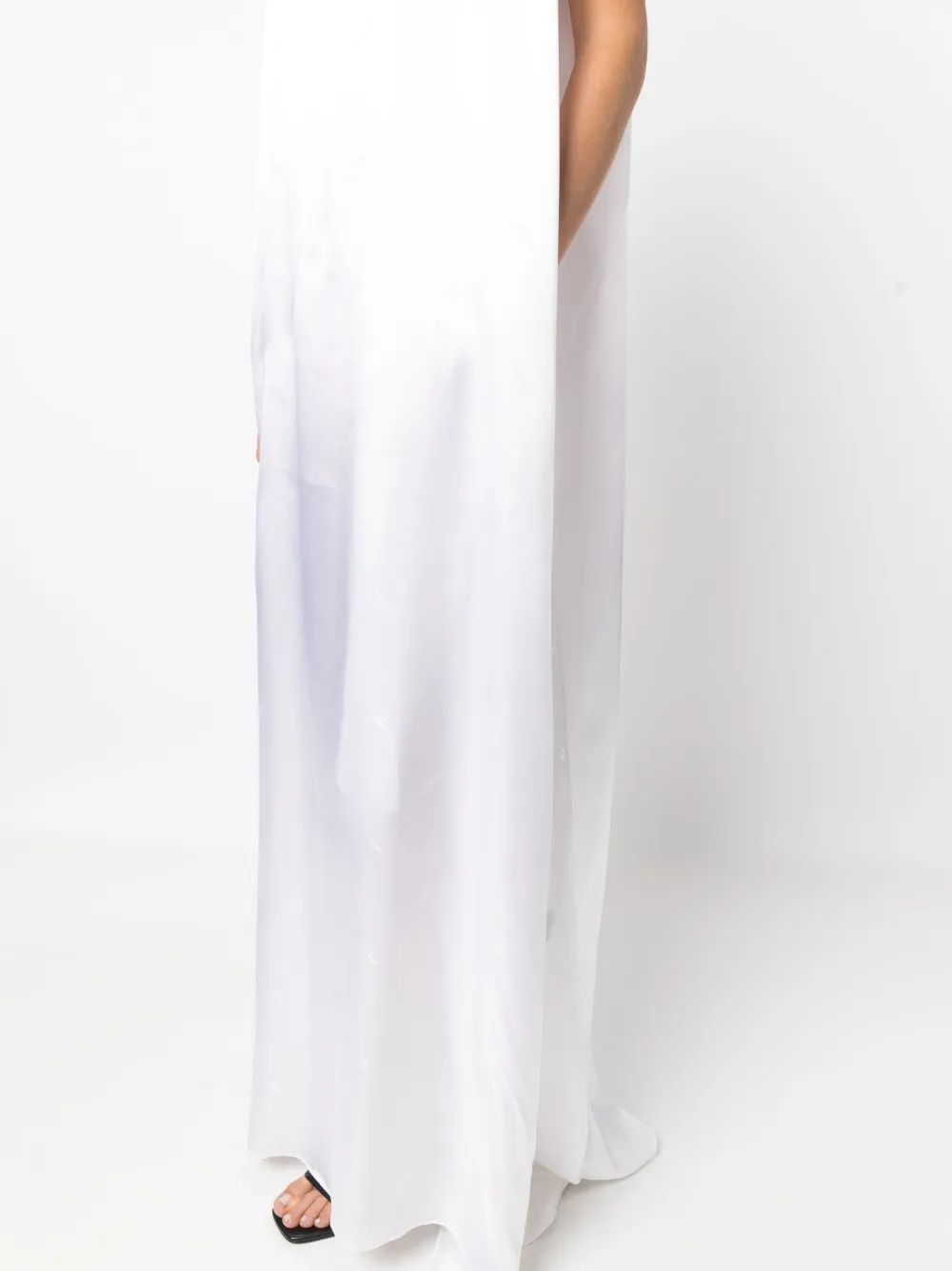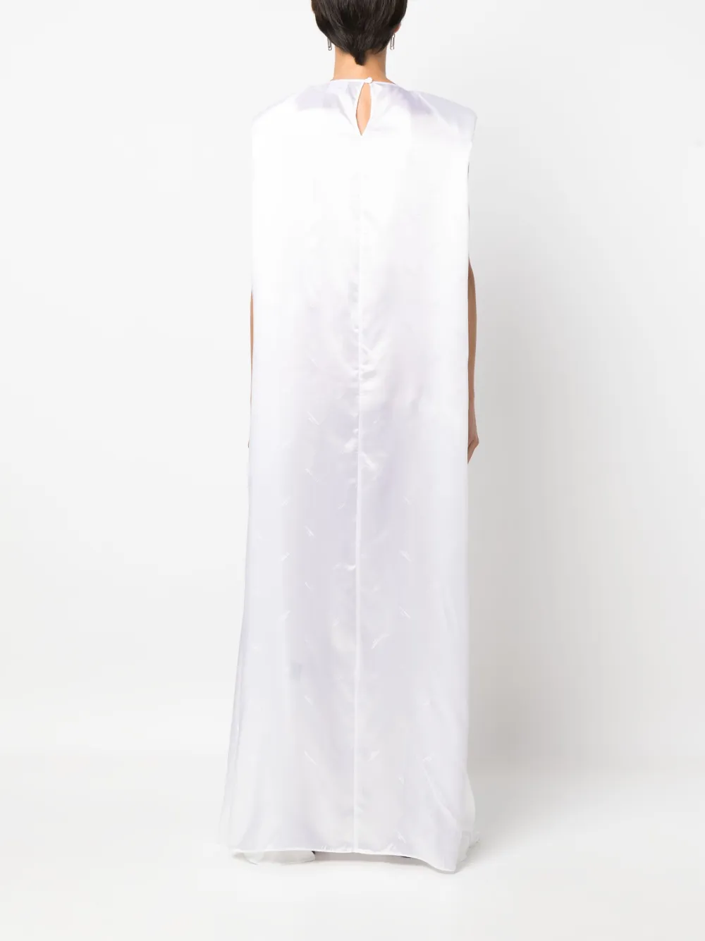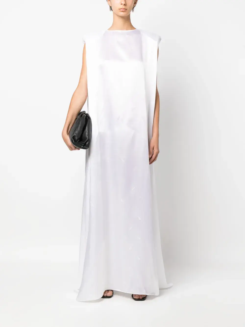 Белый, сплошной принт с логотипом, круглый вырез, вырез сзади, короткие рукава и длина макси.