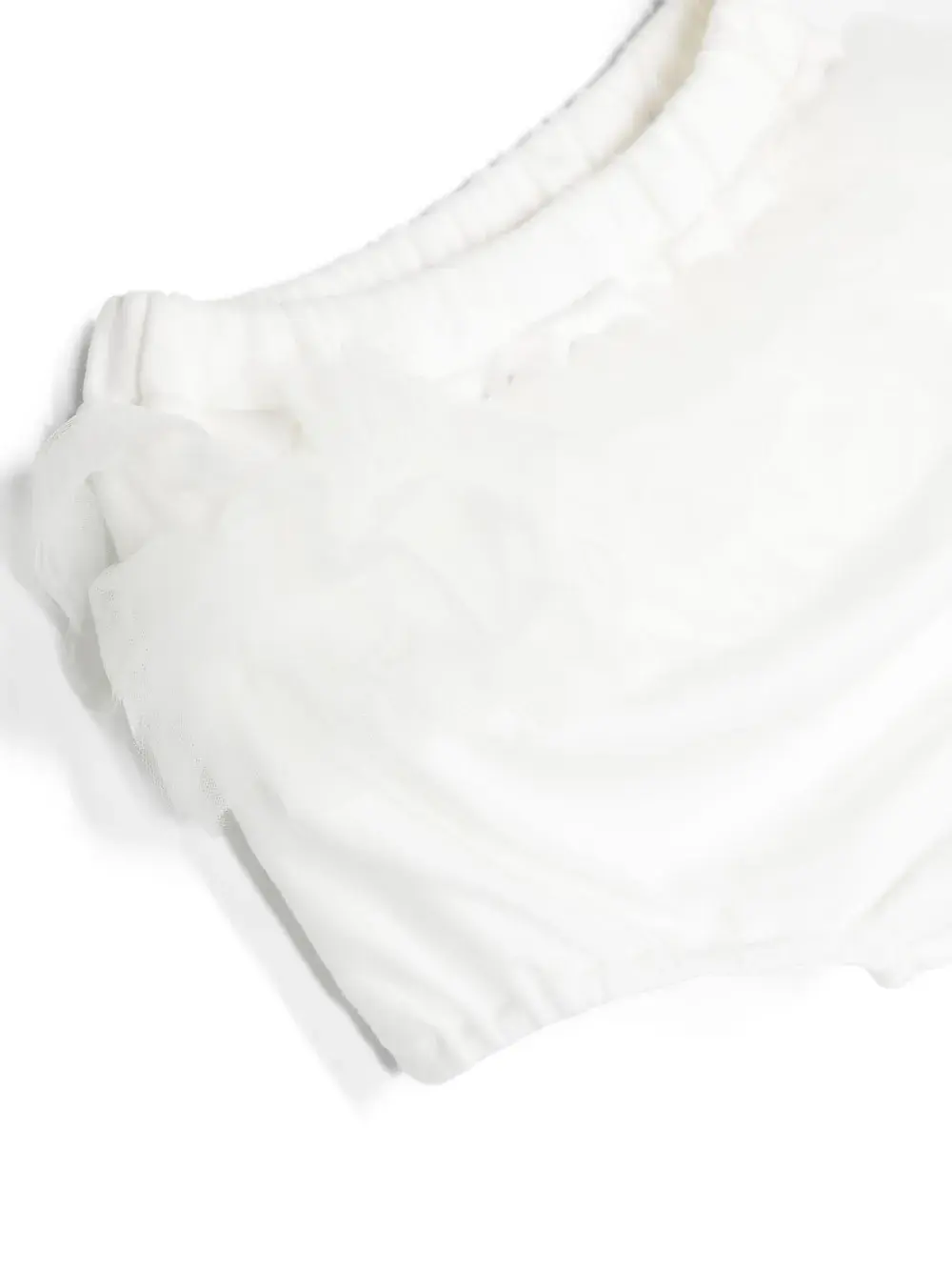 Белый, хлопок, вставки с оборками, верхний слой из тюля, круглый вырез, застежка на молнии сзади, короткие рукава, прямой подол и блумеры в комплементарной расцветке.