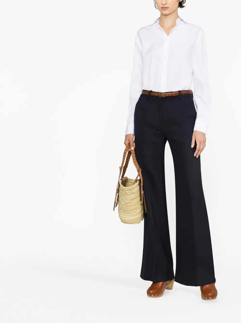 Белый, хлопок, поплин, отложной воротник, застежка на пуговицах спереди, длинные рукава, манжеты на пуговицах и закругленный подол.