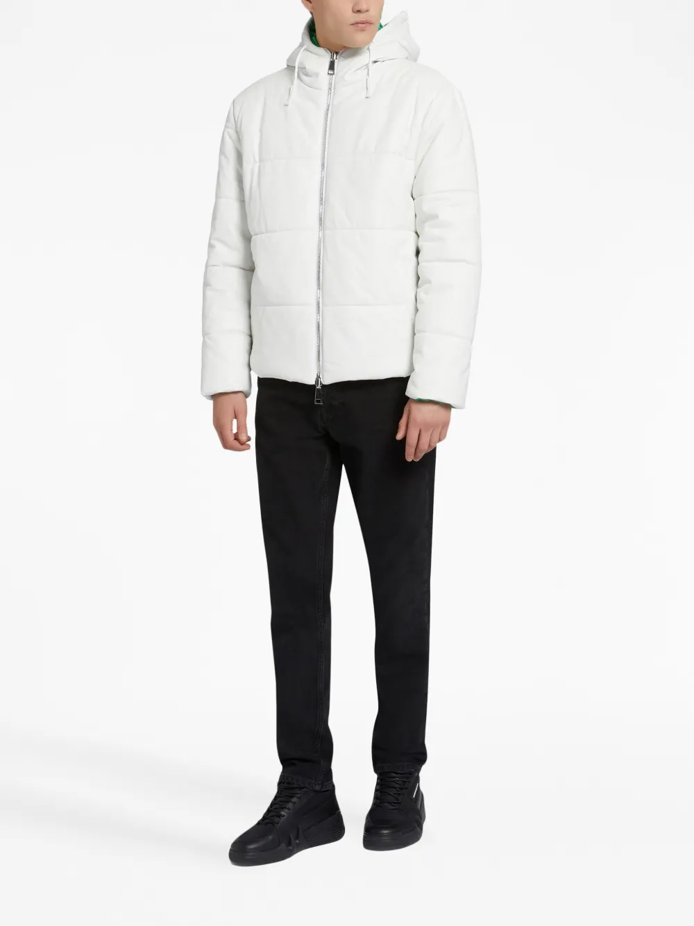 Белый, кожа, дутый материал, затягивающийся на шнурок капюшон, нашивка с логотипом сзади, застежка на молнии спереди, длинные рукава и два вшитых кармана по бокам.