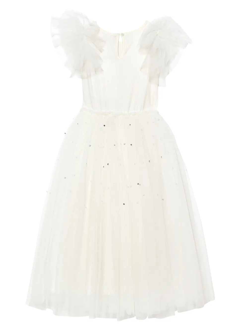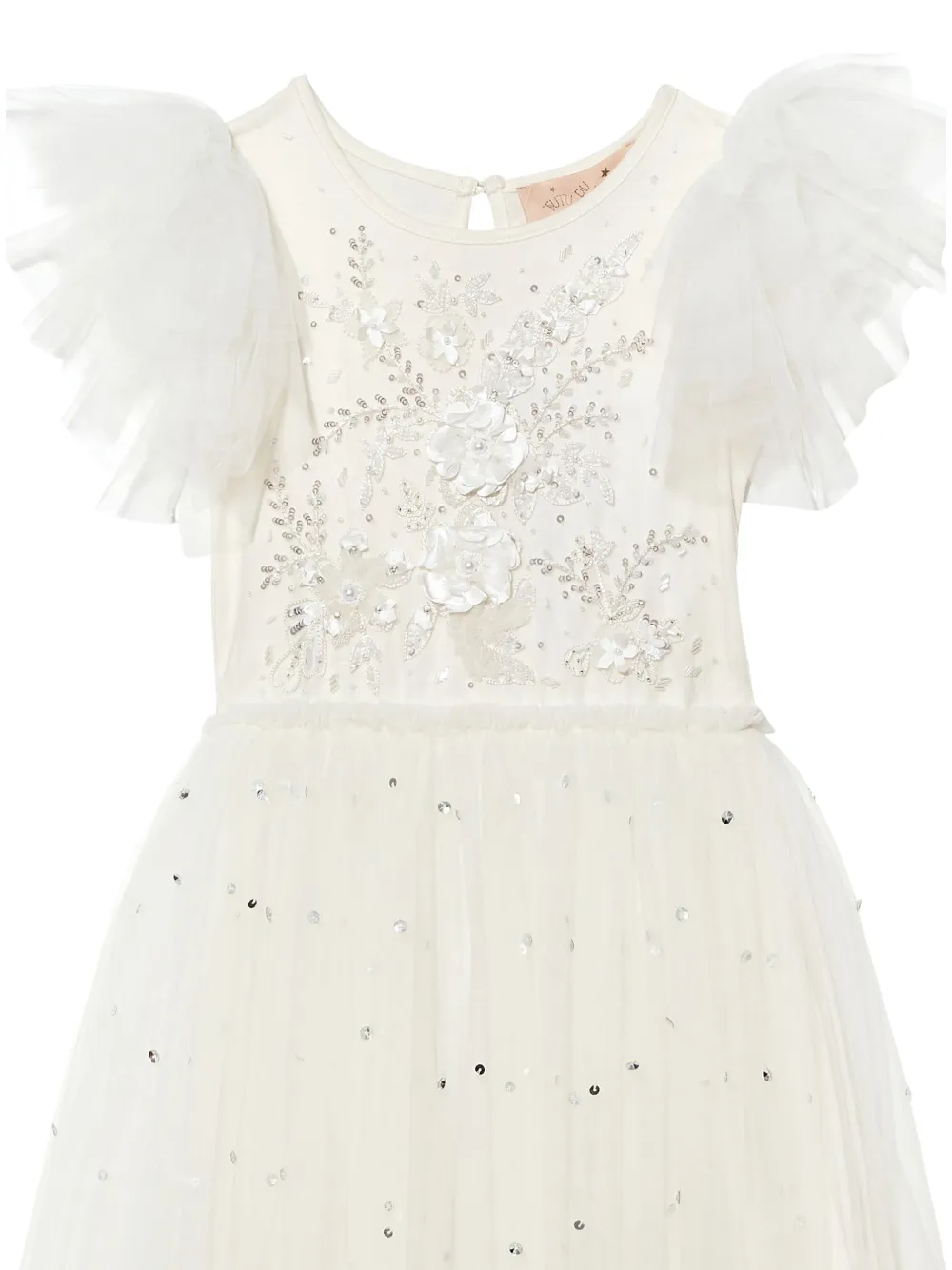 Молочно-белый, хлопок, верхний слой из тюля, вставки с оборками, аппликация из кружева с цветочным узором, декор из бисера, круглый вырез, короткие рукава, эластичный пояс, застежка на пуговицу сзади и пышная юбка.