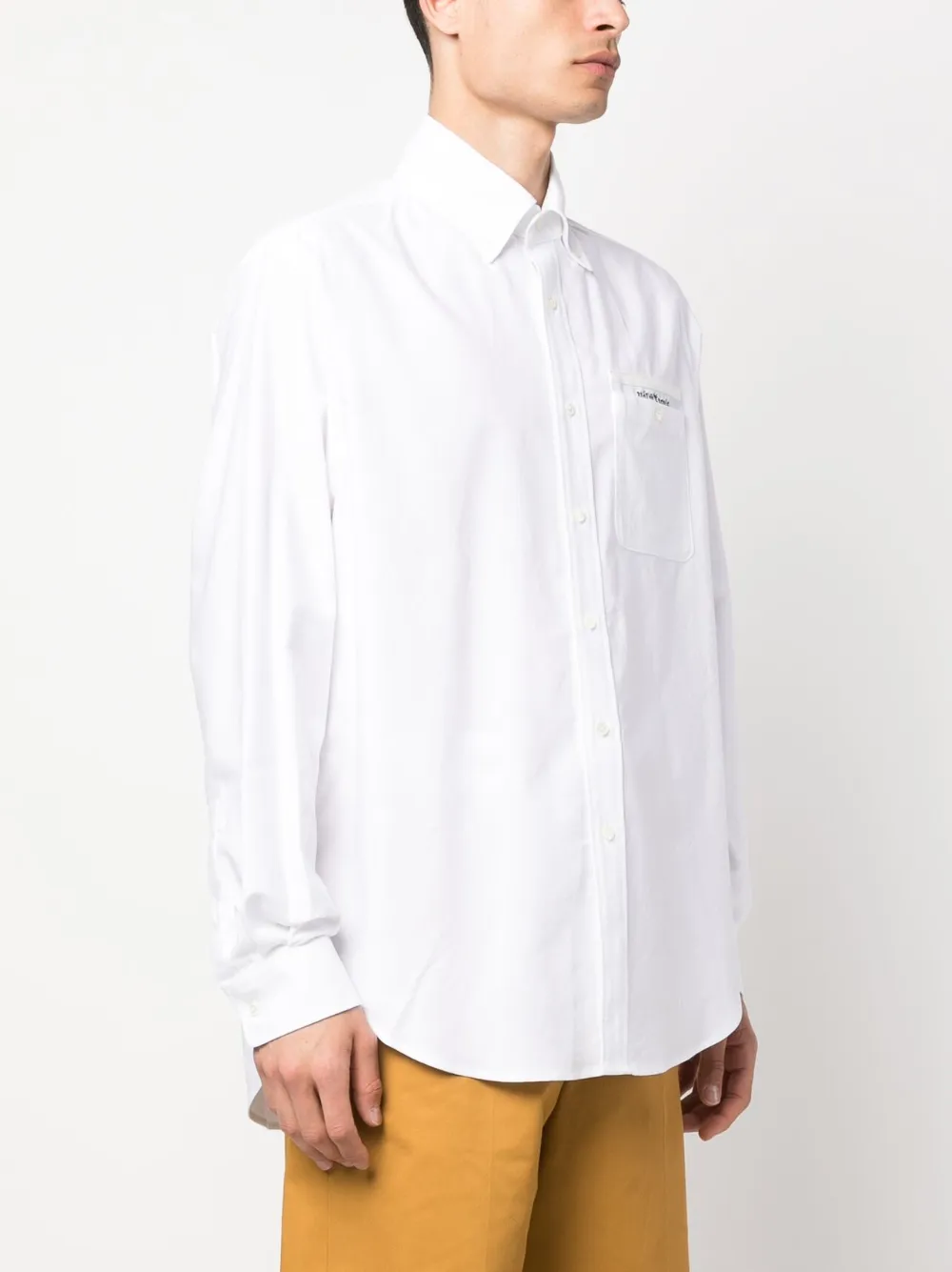 Белый, хлопок, отделка лентой с логотипом, отложной воротник, застежка на пуговицах спереди, нагрудный накладной карман, длинные рукава, манжеты на пуговицах и закругленный подол.