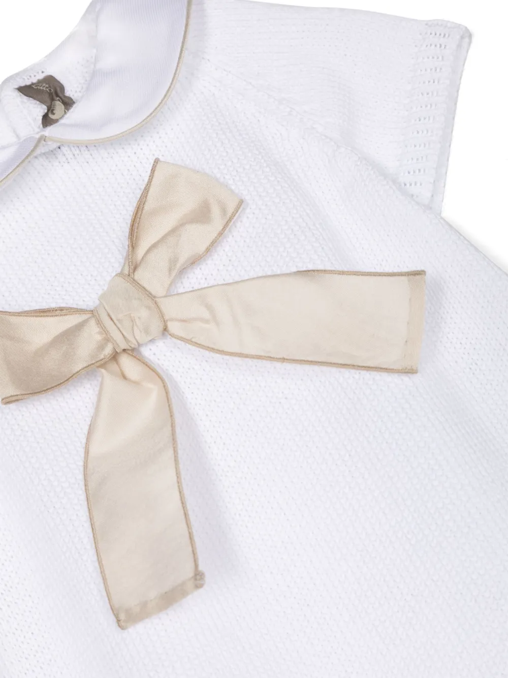 Белый, бежевый, хлопок, трикотажный материал, бант, клубный воротник и застежка на пуговицы сзади.