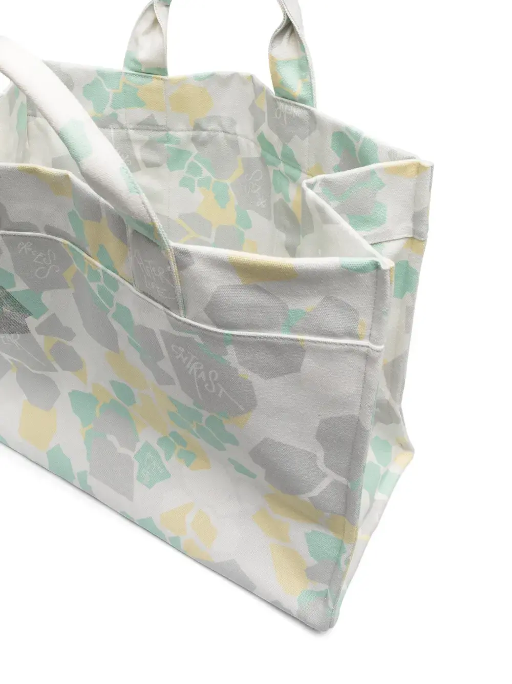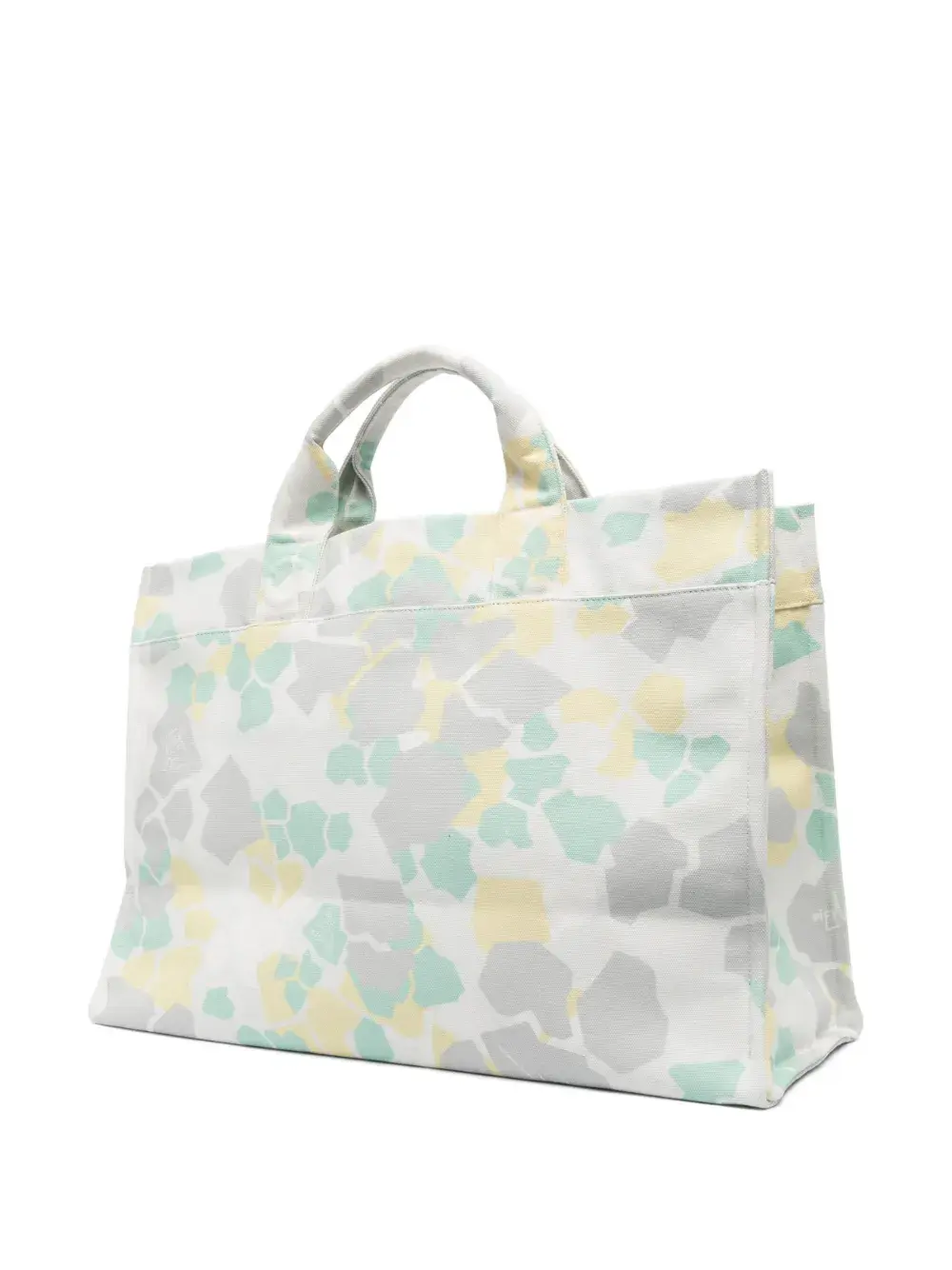 Кремовый, светло-желтый, светло-зеленый, хлопок, парусина, абстрактный принт, логотип спереди, две верхние ручки, дизайн с открытым верхом, основное отделение и внутренние прорезные карманы.