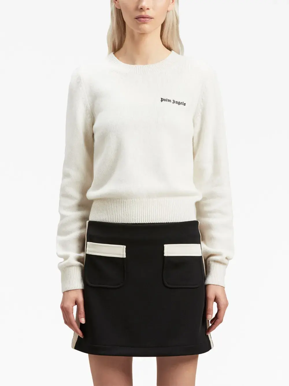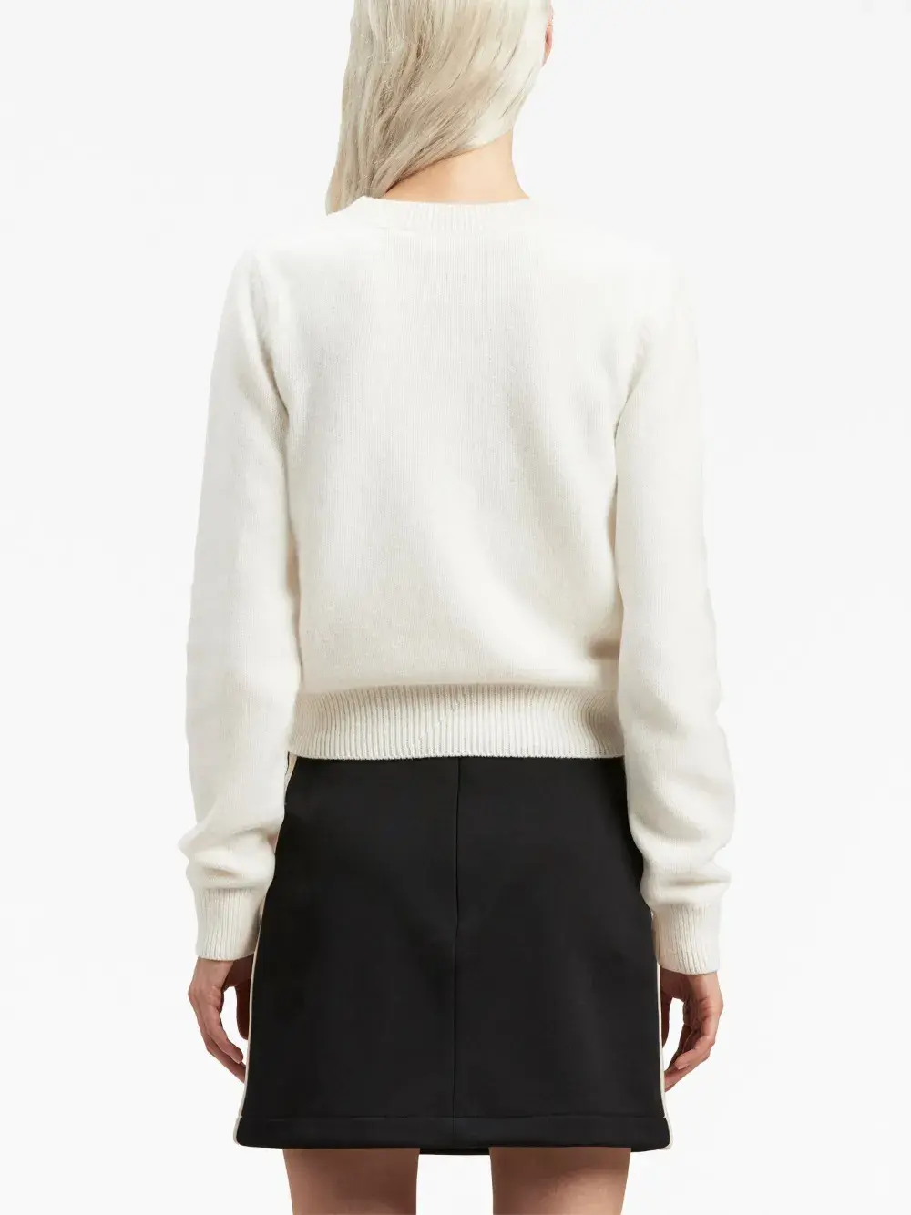 Белый/черный, трикотажный материал, тонкая вязка, вышитый логотип на груди, круглый вырез, длинные рукава и прямой подол.
