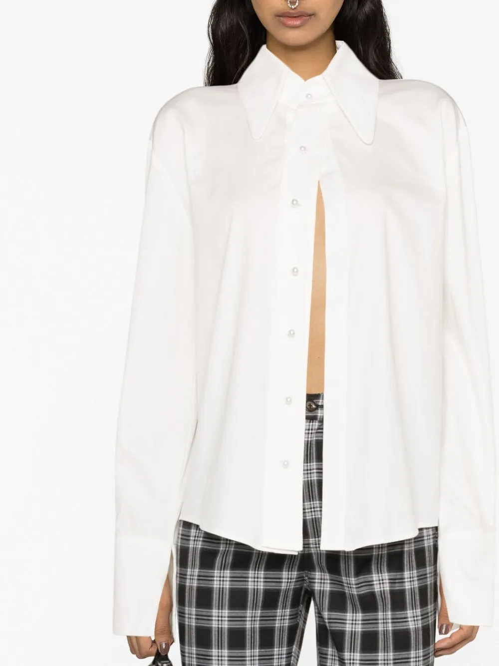 Кремовый, хлопок, широкий заостренный воротник, застежка на пуговицах спереди, длинные рукава, манжеты с разрезами и закругленный подол.