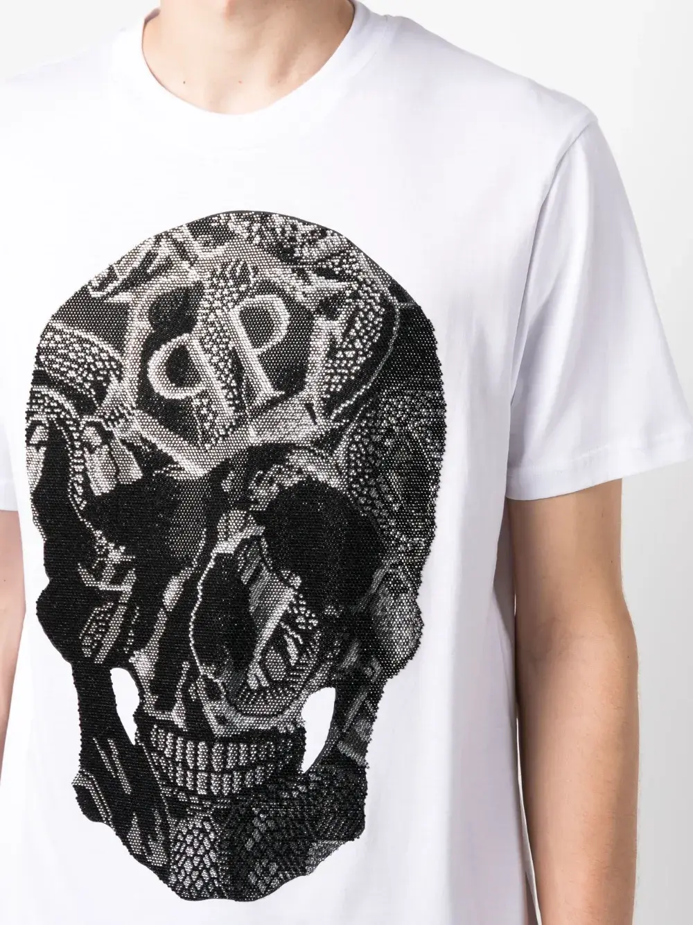 Белый/черный, хлопок, ткань джерси, принт с изображением черепа спереди, логотип спереди, металлический логотип, круглый вырез, короткие рукава и прямой подол.