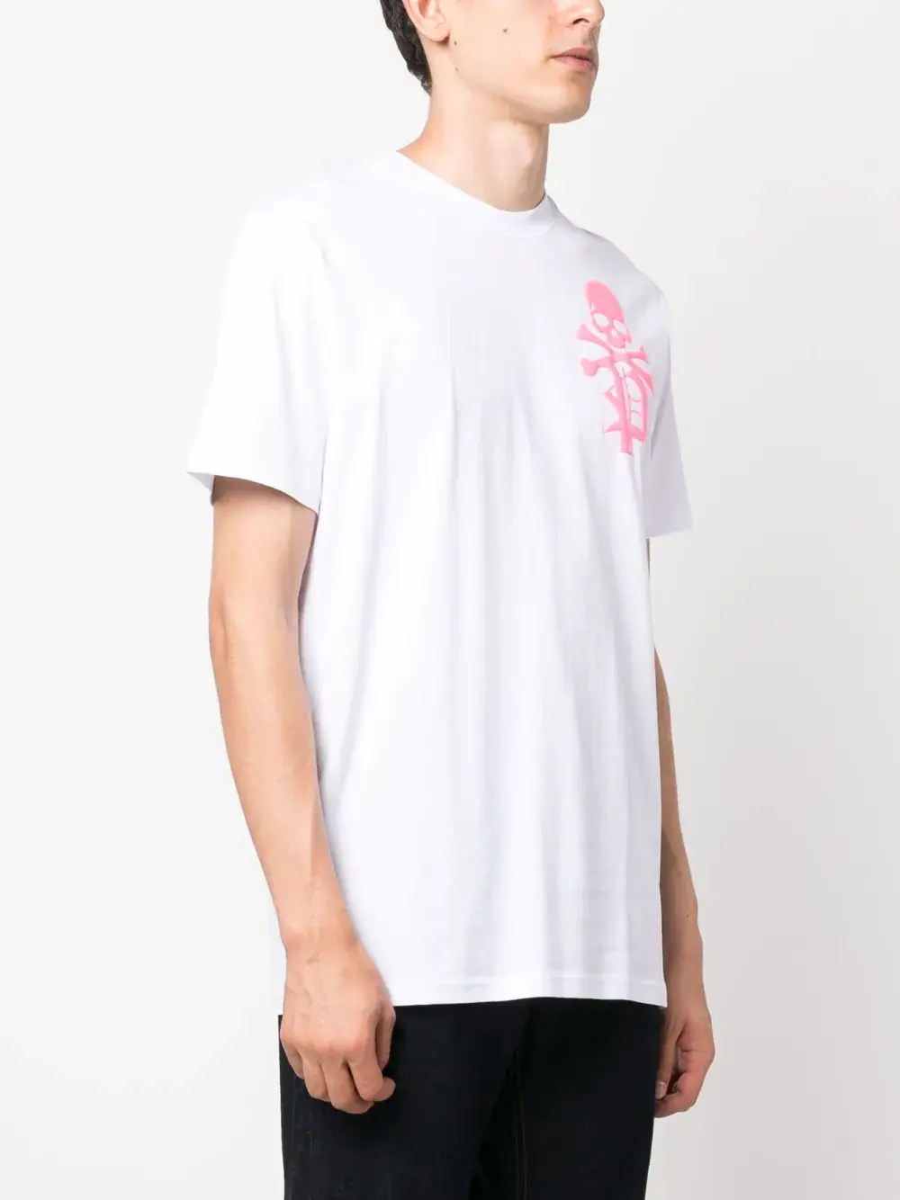 Белый, хлопок, принт с изображением черепа спереди, принт с логотипом на груди, металлический логотип, круглый вырез, короткие рукава и прямой подол.