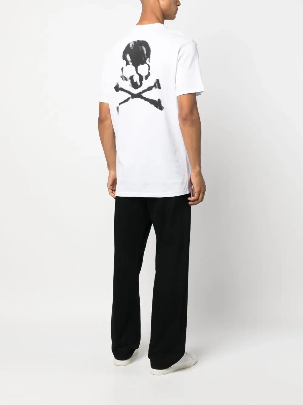 Белый, хлопок, принт с логотипом на груди, принт с изображением черепа на тыльной стороне, круглый вырез, короткие рукава и прямой подол.