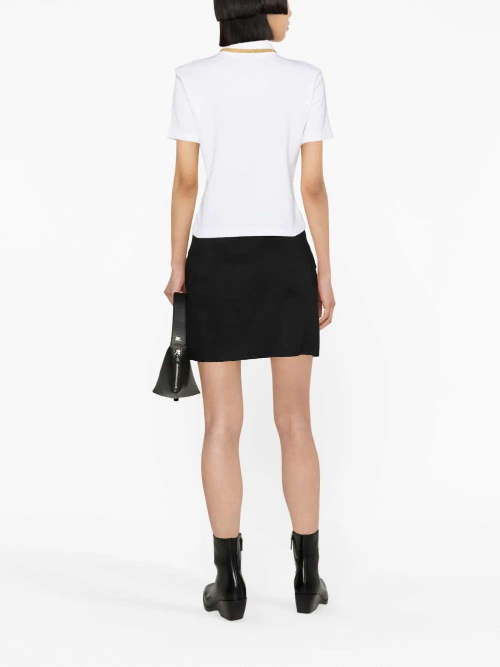 Белый, хлопок, золотистая отделка, вышитый логотип на груди, воротник поло, планка на пуговицах спереди, короткие рукава и прямой подол.