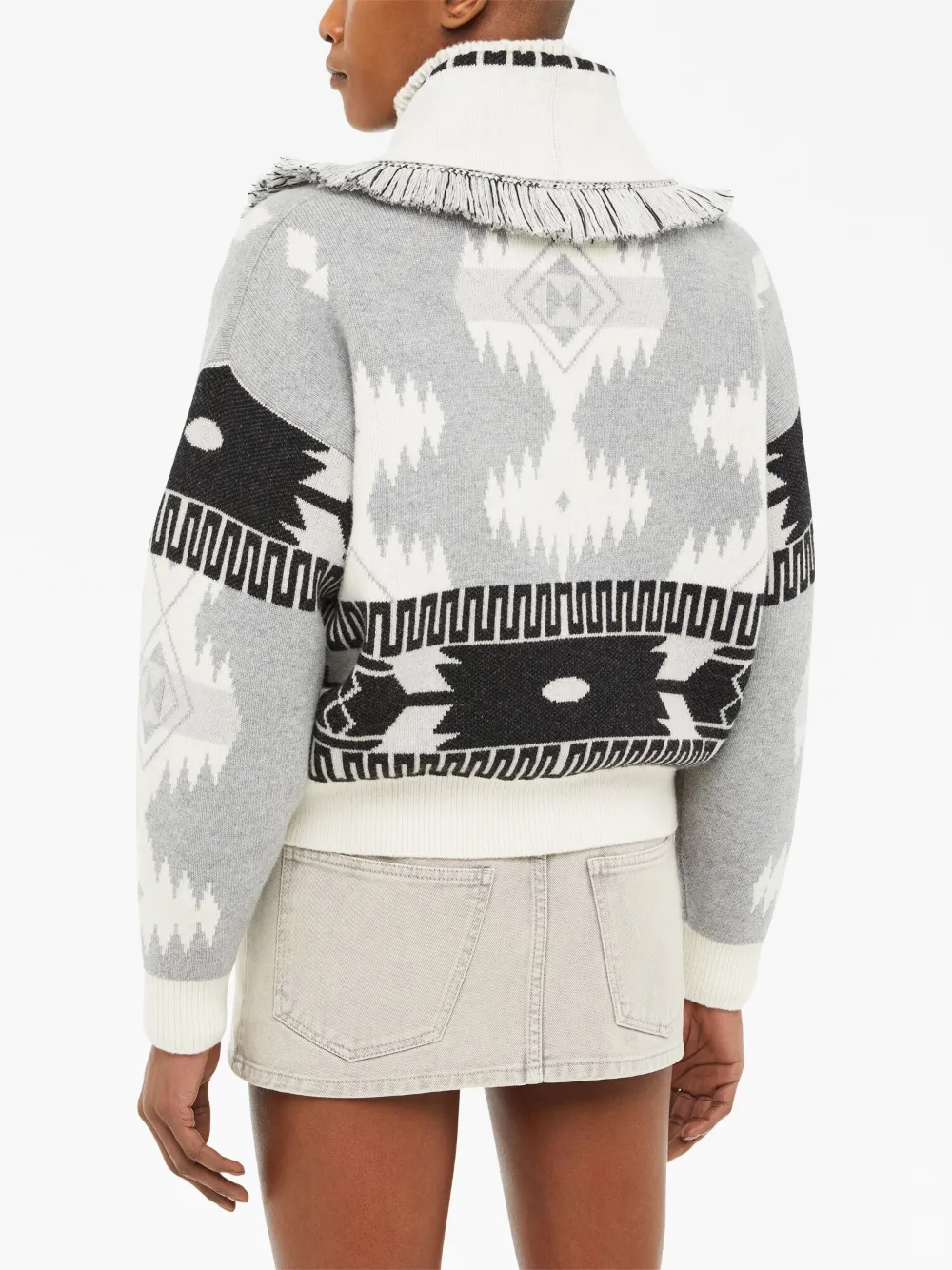 Белый/черный, смесь шерсти и кашемира, жаккардовый материал с узором, края с бахромой, лацканы-шалька, застежка на пуговицах спереди, приспущенные плечи и вязаные края в рубчик.
