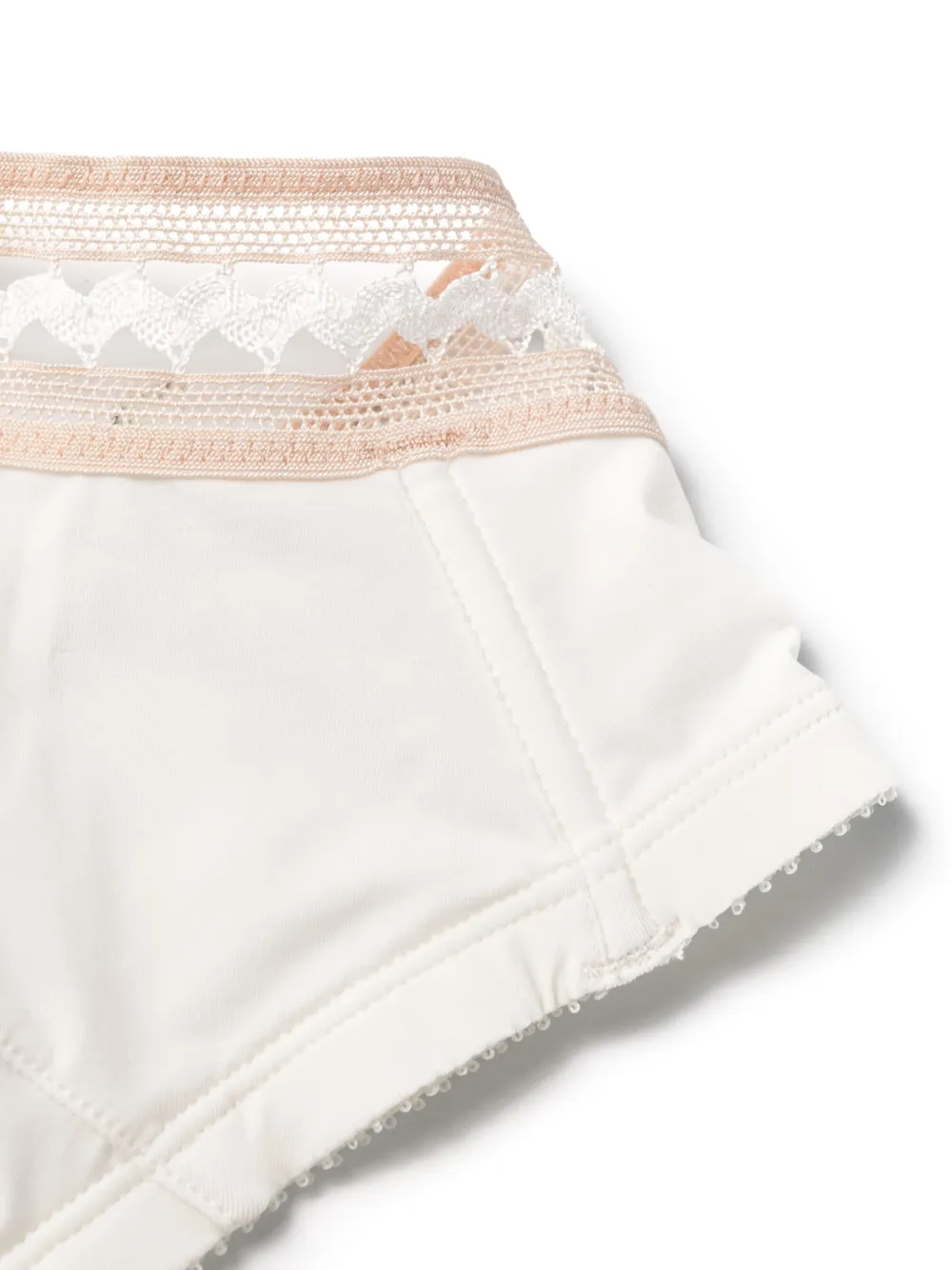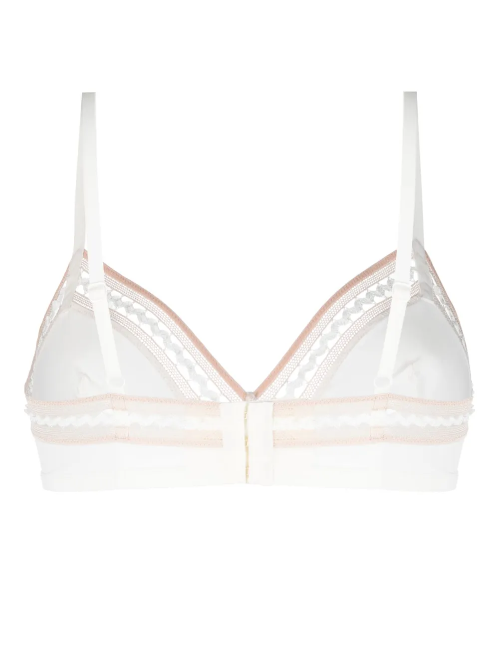 Белый, розовый, вставки из кружева, треугольная чашка, регулируемые тонкие бретели и застежка на крючок сзади.